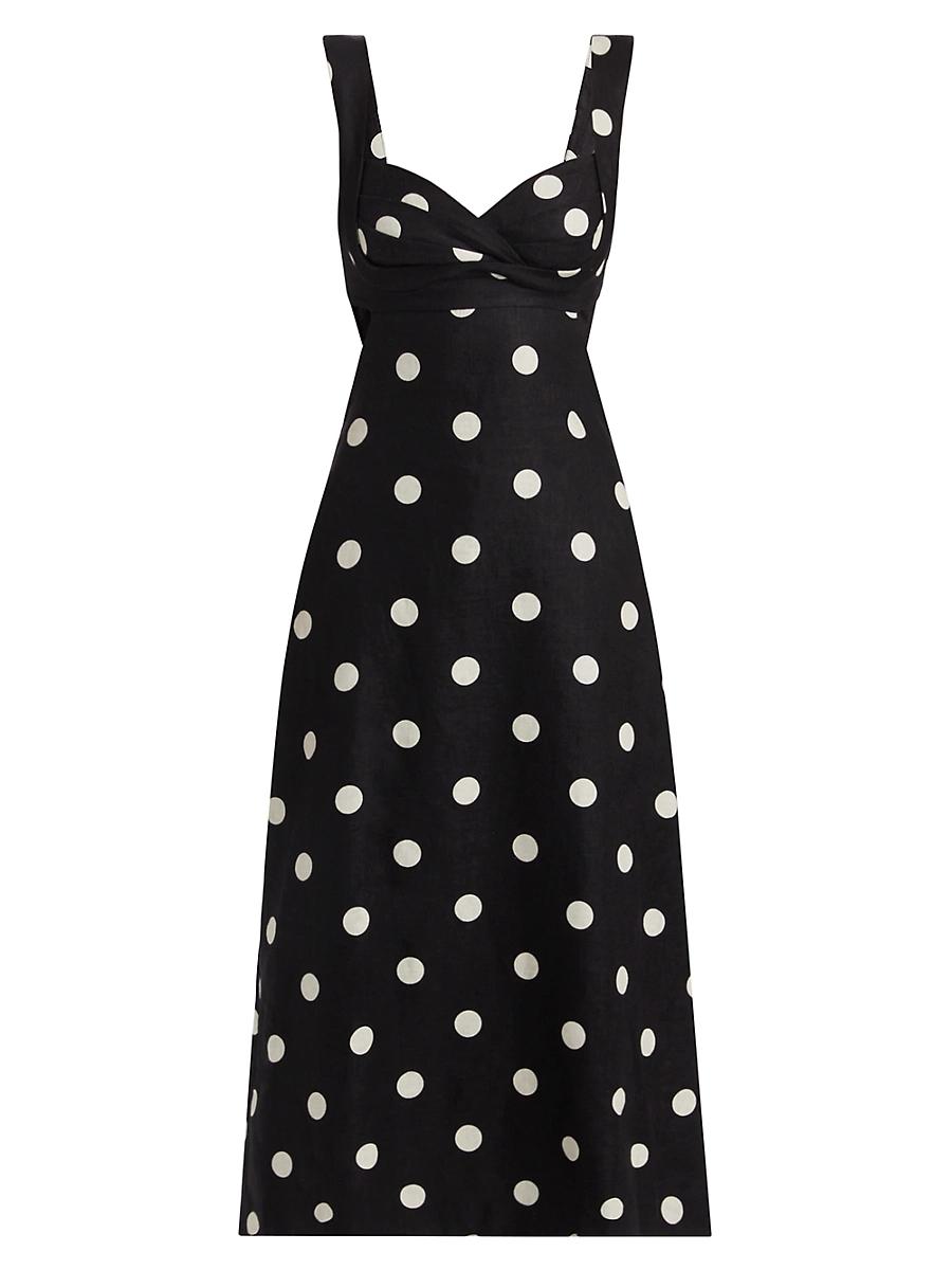 Crafted of linen, Zimmermanns Crush midi-dress showcases a polka dot print and portrait neck. Portrait neck Fixed straps Back zip closure 100% linen Lining: 100% cotton Dry clean Imported SIZE & FIT About 52 from shoulder to hem Model measurements: 510 tall Model is wearing a US size 4 ABOUT THE BRAND Australian founders and sister-duo Nicky and Simone Zimmermann design with a signature feminine aesthetic, each piece rife with tiers of fabric, rich embroidery and splashy prints. From ruffled bikinis and beachwear to luxe, intricately patterned maxi (and mini) dresses, everything is overtly romantic in the most elevated, effortless way. Contemporary Sportswear - Zimmermann > Zimmermann > Saks Fifth Avenue > Barneys. Zimmermann. Color: Black Cream Dot. Size: 4.