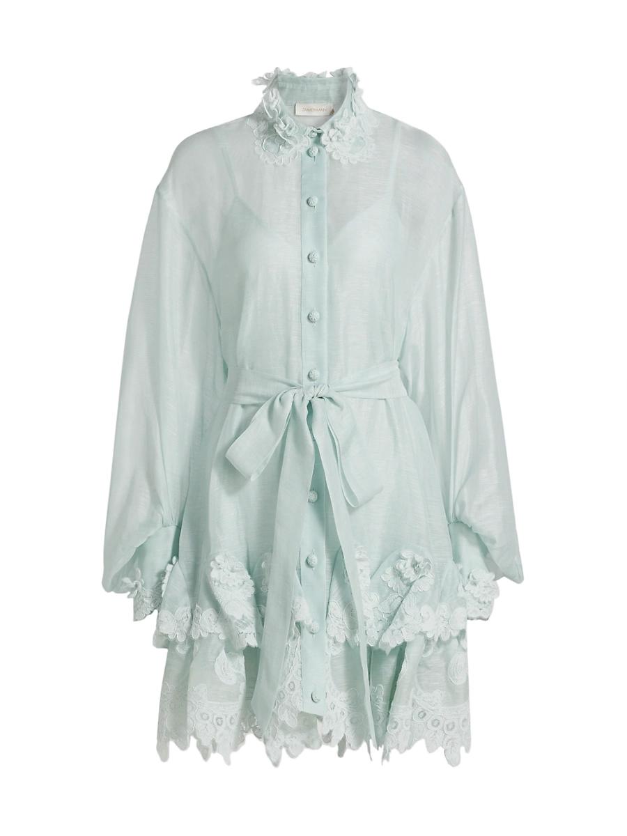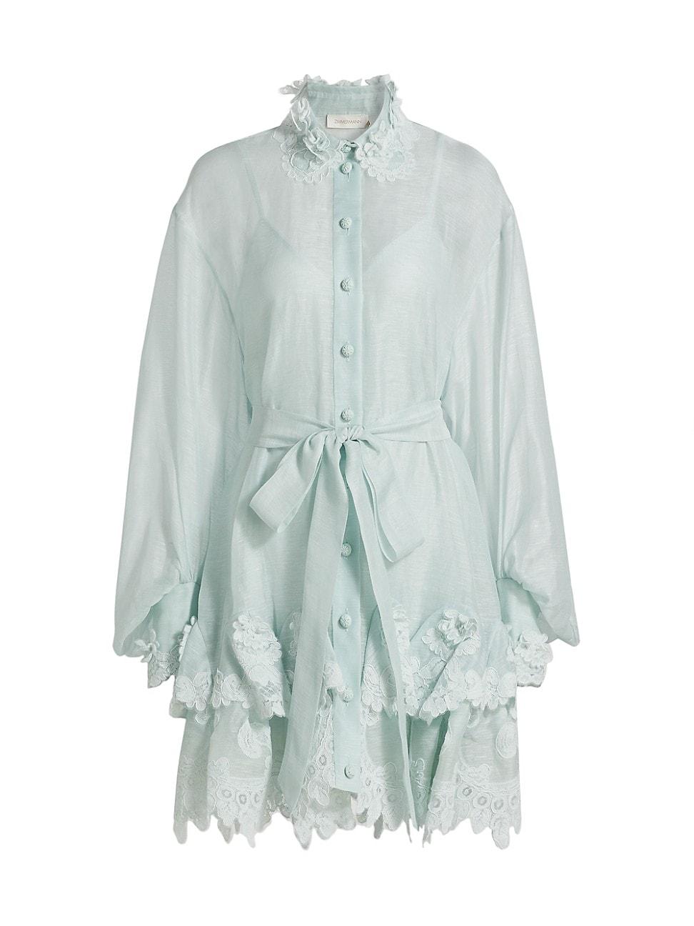 Crafted of a linen-silk blend, Zimmermanns Crush mini shirtdress showcases a floral lace-trim godet tiered skirt and long blouson sleeves. Spread collar Long sleeves Self-tie belt Button-front closure 55% linen/45% silk Dry clean Imported SIZE & FIT About 35 from shoulder to hem Model measurements: 510 tall Model is wearing a US size 4. Contemporary Sportswear - Zimmermann > Zimmermann > Saks Fifth Avenue > Barneys. Zimmermann. Color: Mint. Size: 4.