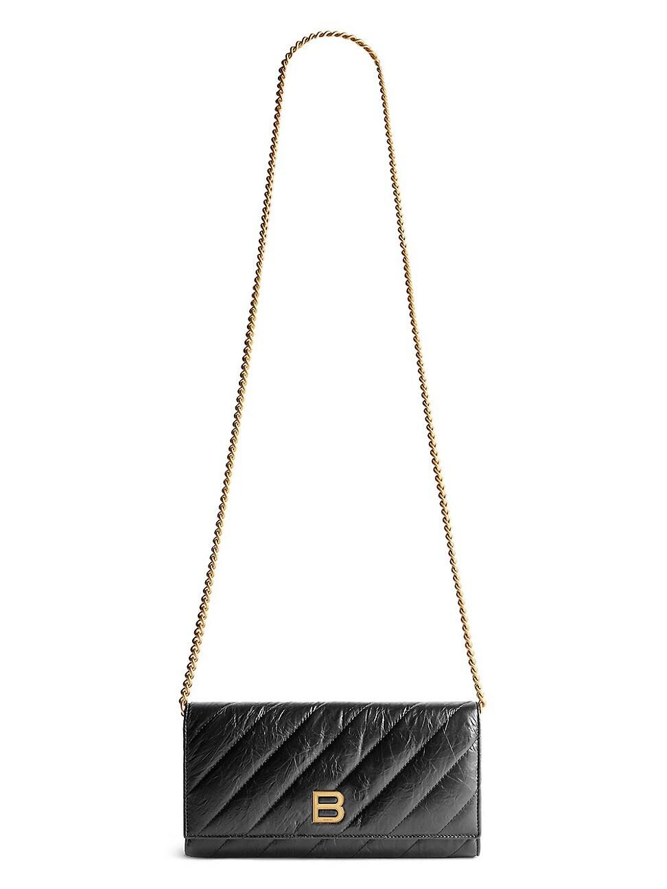 Crush wallet on chain quilted in crushed calfskin, aged-gold hardware. Crushed calfskin and quilted Wallet on chain Aged-gold B logo hardware Studded magnet closure 1 inner patch pocket 6 inner card slots Nappa lambskin lining Wipe with a soft cloth Made in Italy SIZE Dimensions: L8.5 x H4.3 x W0.8 in. Removable chain strap (drop: 19.7 in.). Lsd Handbags - Balenciaga > Balenciaga > Saks Fifth Avenue > Barneys. Balenciaga. Color: Black.