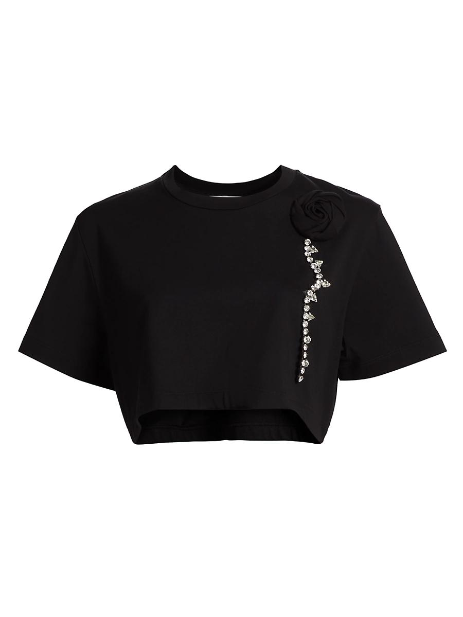 Crafted of stretch-cotton jersey, this cropped T-shirt from Area is embellished with a floral rosette adorned with glass crystals. Crewneck Short sleeves Pulls over 95% cotton/5% elastane Trim: 100% glass crystal Dry clean Made in Italy SIZE & FIT Model measurements: 510 tall Model is wearing a US size Small ABOUT THE BRAND Founded in 2014 by designers Beckett Fogg and Piotrek Panszczyk in downtown New York City, AREA is a design studio with a bold perspective. The label focuses on innovative embellishments on its playful ready-to-wear and accessories. Infused with energy and eclecticism, AREA is a favorite pick for Hollywood starlets. Advanced European - Italian Collections > Area > Saks Fifth Avenue > Barneys. Area. Color: Black. Size: Large.