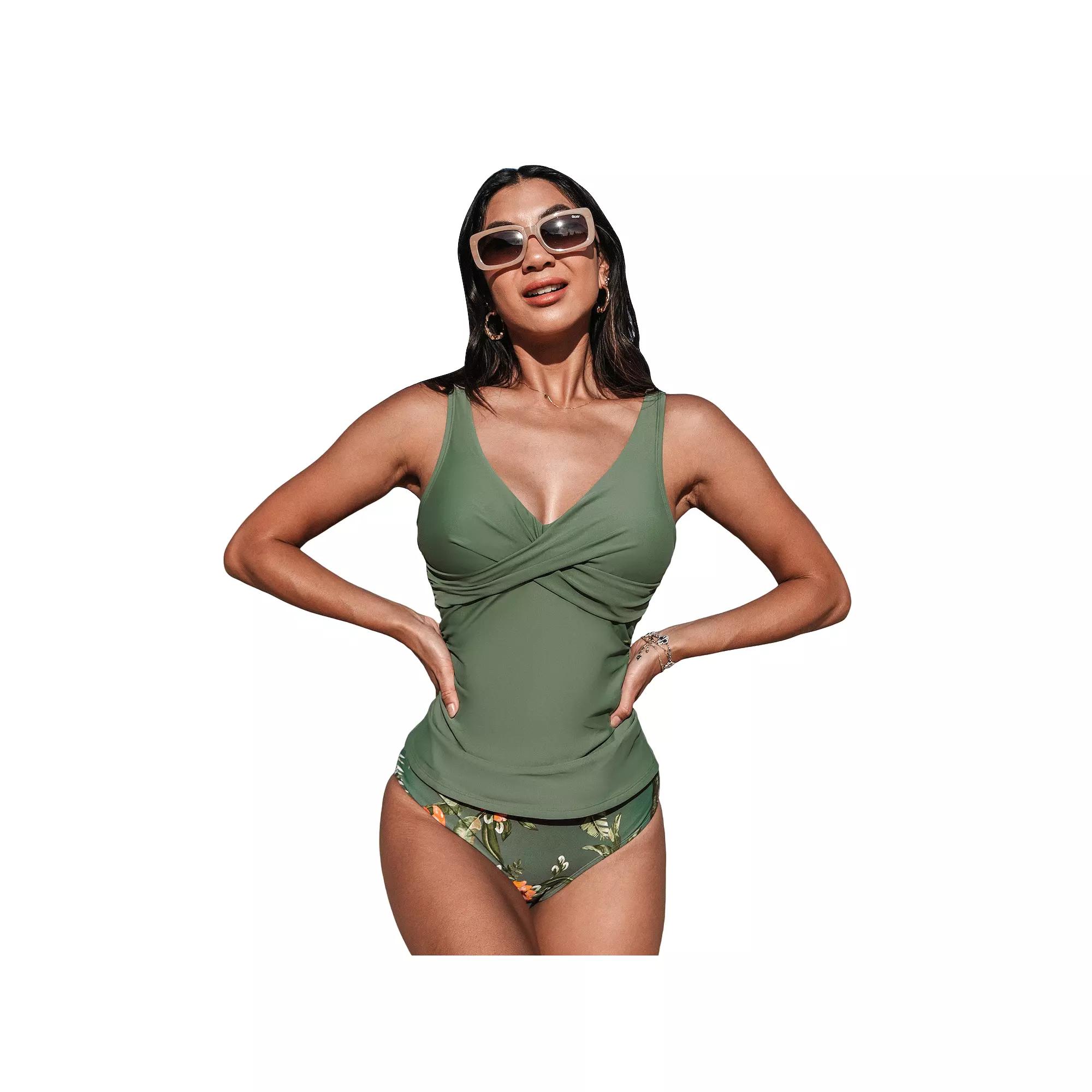 Women's Cupshe Ruched Tankini Top & Tropical Mid-Rise Bottoms Swimsuit Set,