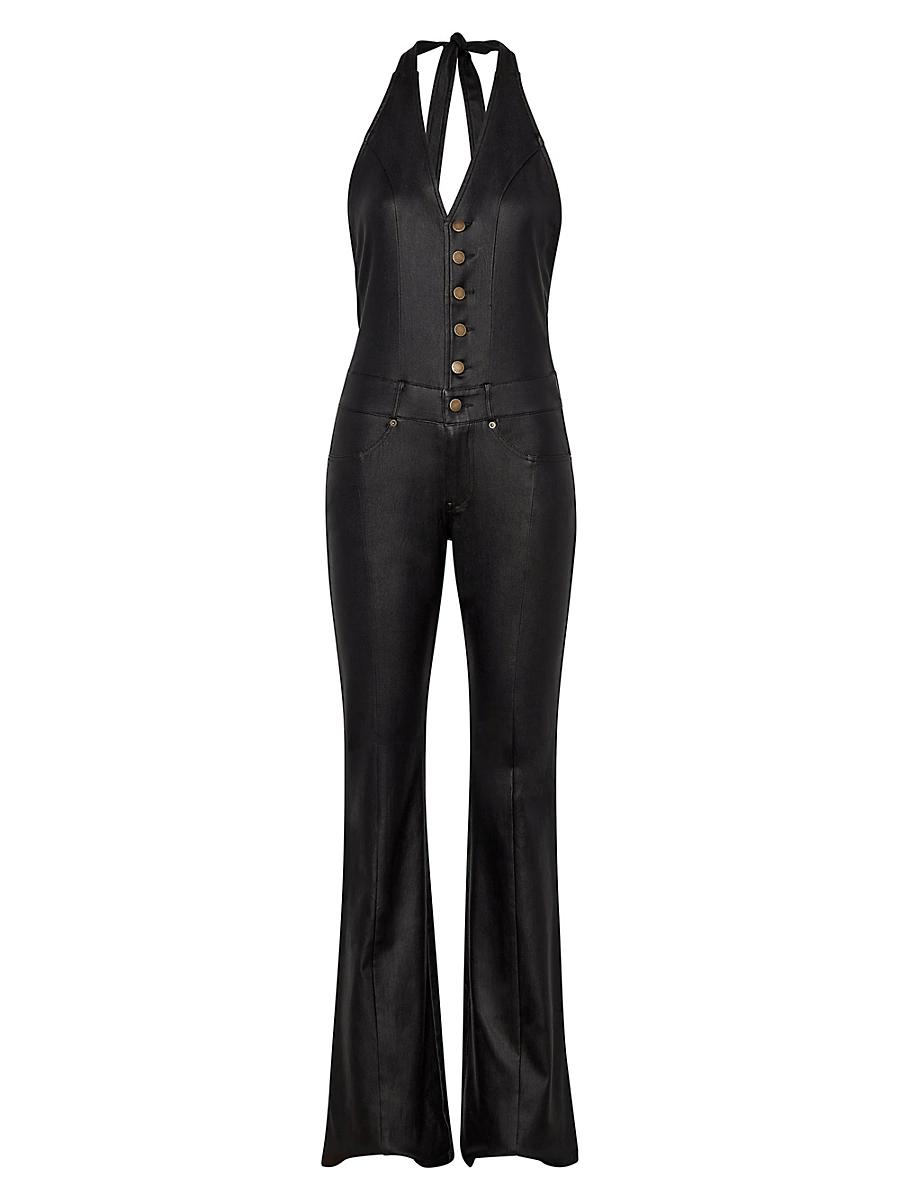 Retrofte Cynthiacoated denim open-back jumpsuit detailed with front pockets and belt loops Approx. 64L from shoulder to hem Halter neckline; ties behind neck Sleeveless Adjustable mid-back strap Slim fit through hip and thigh Elongated flared legs Full length Rayon/cellulose acetate/nylon/polyamide/spandex Dry clean Imported