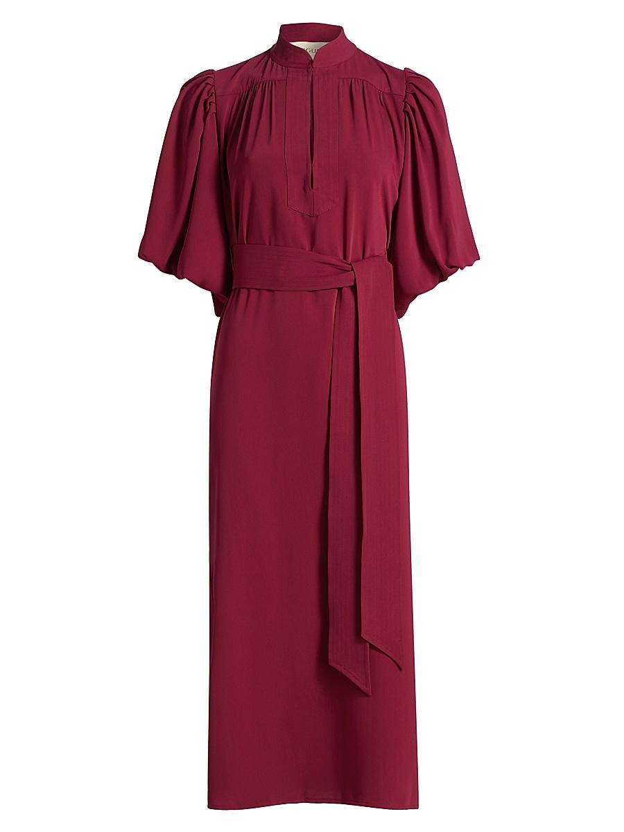 Figues Dani midi-dress is styled with a V-neck, elbow-length puff sleeves, and a self-tie belt. V-neck Elbow-length puff sleeves Side slits Self-tie belt Pulls over 100% polyester Dry clean Imported SIZE & FIT Model measurements: 510 tall Model is wearing a US size Small. Designer Lifestyle - Emerging Lifestyle > Figue > Saks Fifth Avenue. Figue. Color: Sangria Red. Size: XS.