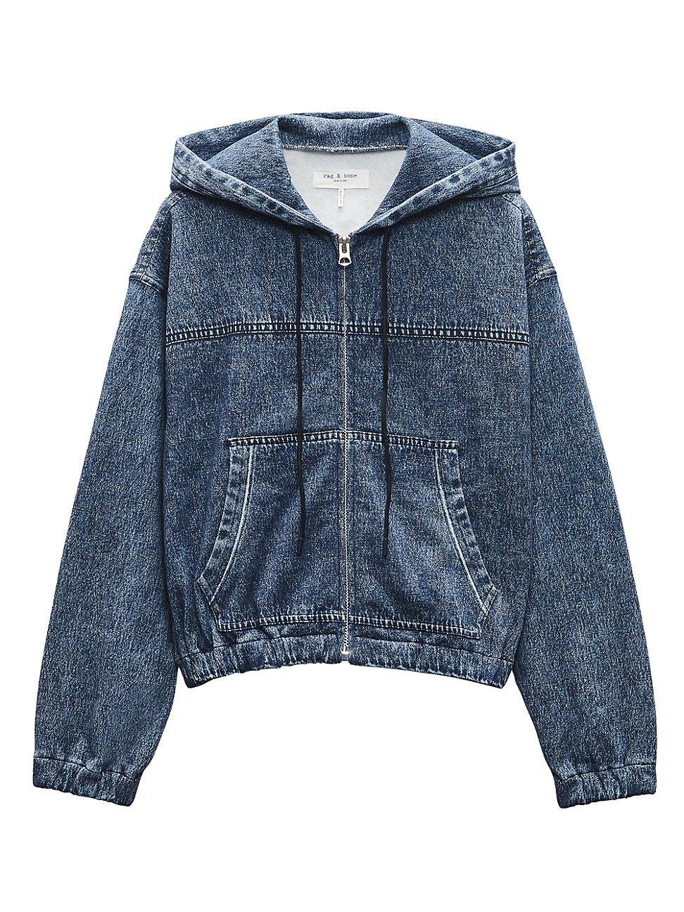 Crafted of soft cotton, rag & bones Davina hoodie showcases a soft fleece lining and a denim-like look. This piece features a drawstring hood, dropped shoulders, and a split kangaroo pocket. Drawstring hood Drop shoulders Long sleeves, elasticized cuffs Split kangaroo pocket Front zip closure 100% cotton Machine wash Imported SIZE & FIT About 21 from shoulder to hem Model measurements: 510 tall Model is wearing a US size Small ABOUT THE BRAND In 2002, rag & bone founder Marcus Wainwright combined his British heritage with a downtown-New York aesthetic to set the tone for the label. At the heart of the edgy-yet-laid-back brand is its focus on quality craftsmanship and attention to detail. The epitome of cool, off-duty style, its no wonder the signature second-skin denim is favored by many. Contemporary Sportswear - Denim And Bottoms > Rag & Bone > Saks Fifth Avenue > Barneys. rag & bone. Color: Topaz. Size: Small.