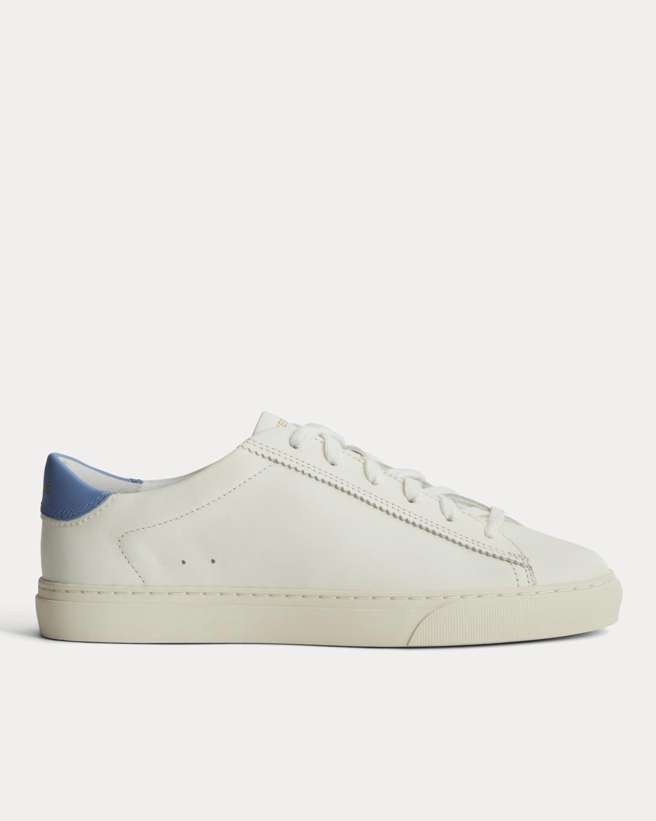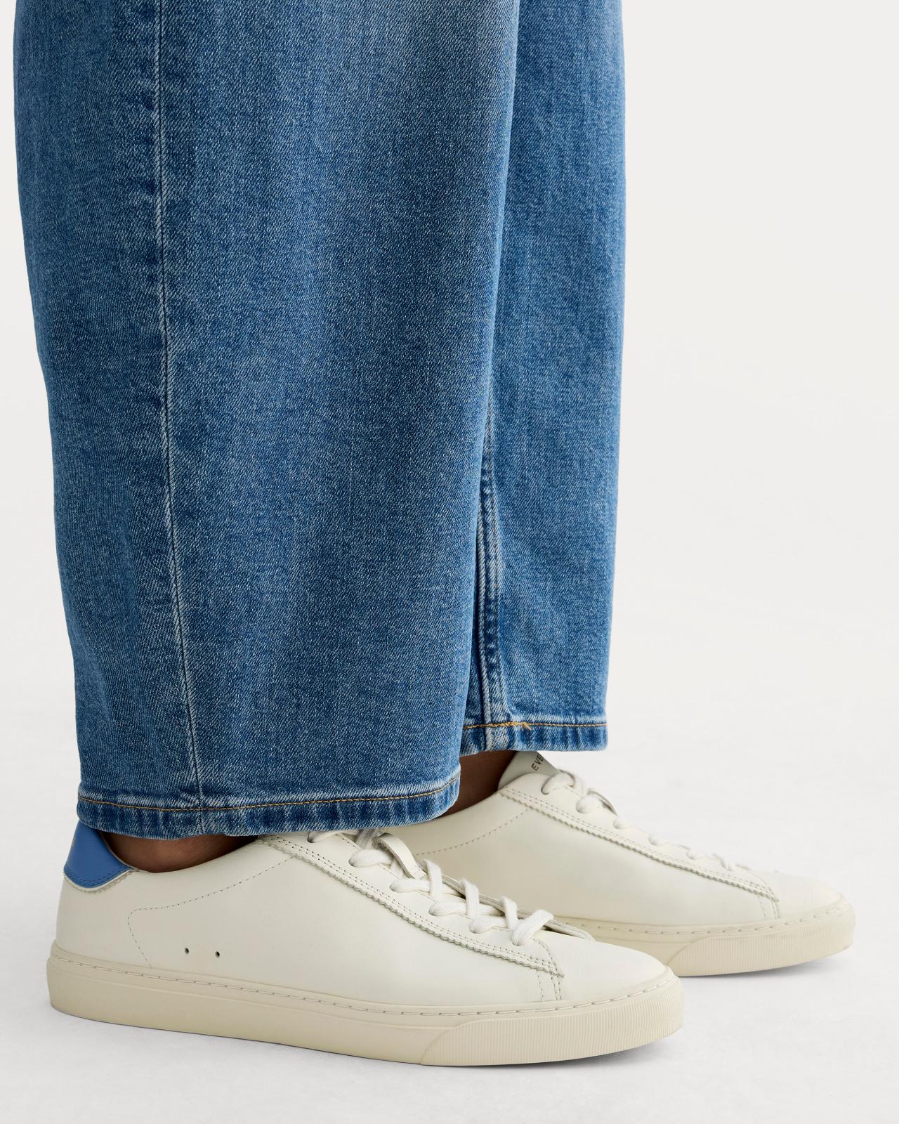 A sleek, essential sneaker. The Day Sneaker features a slightly tapered toe, a classic lace-up design, a versatile low-ankle height, and a contrast rubber outsole for durability in new colors. Easy to dress up with our Everlane Editions collections or dress down with our signature Way-High® denim. This shoe showcases a rubber outsole made of a natural and recycled rubber blend that’s 94.2% free of virgin plastic, and 100% recycled polyester laces and linings. This leather is sourced from a Leather Working Group Gold-certified tannery. The Leather Working Group (LWG) Audit Standards provide transparency and accountability within the leather supply chain—covering energy and water usage, safe chemical practices, worker health and safety, and wastewater management.