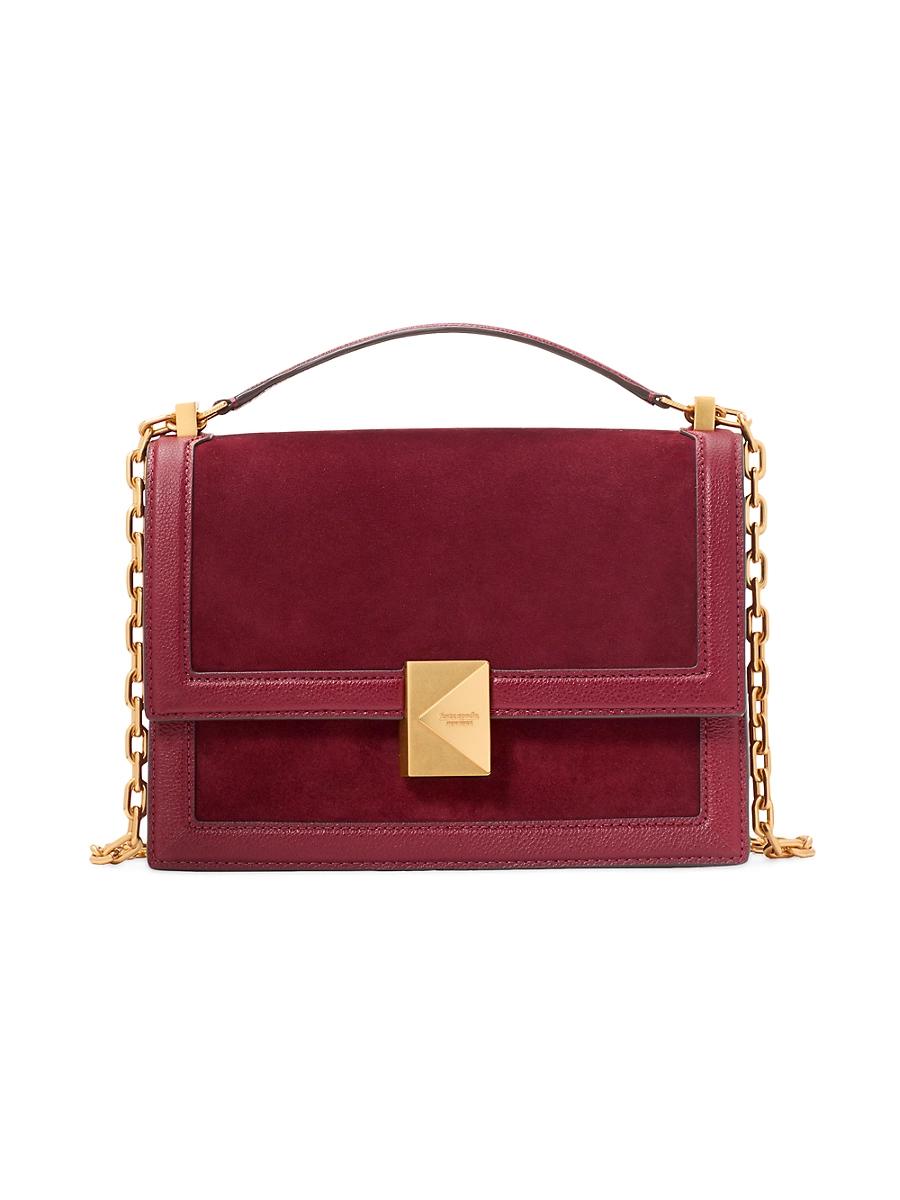 This elegant shoulder bag from kate spade new york is crafted of pebbled leather and suede. It features a chain strap and a warm, matte goldtone finish, exemplifying the brands commitment to sophisticated design and high-quality materials. Top handle Chain-link shoulder strap Interior: one slip and one zip compartment Flap with magnetic snap closure Leather/suede Imported SIZE About 9W x 7H x 3D Chain-link shoulder strap: about 22 drop Weight: about 1 lb. Handbags - Contemporary Handbags > Kate Spade New York > Saks Fifth Avenue > Barneys. kate spade new york. Color: Cherryjuice.