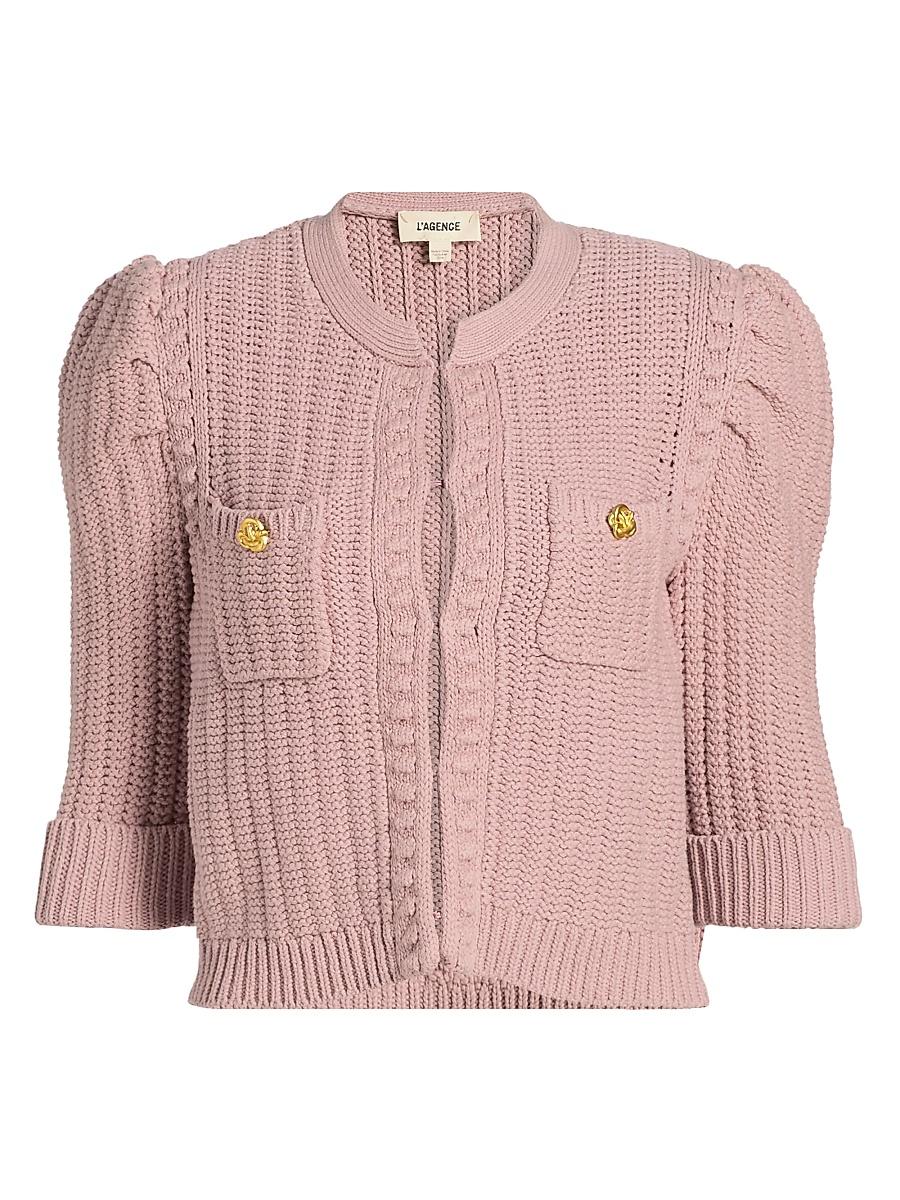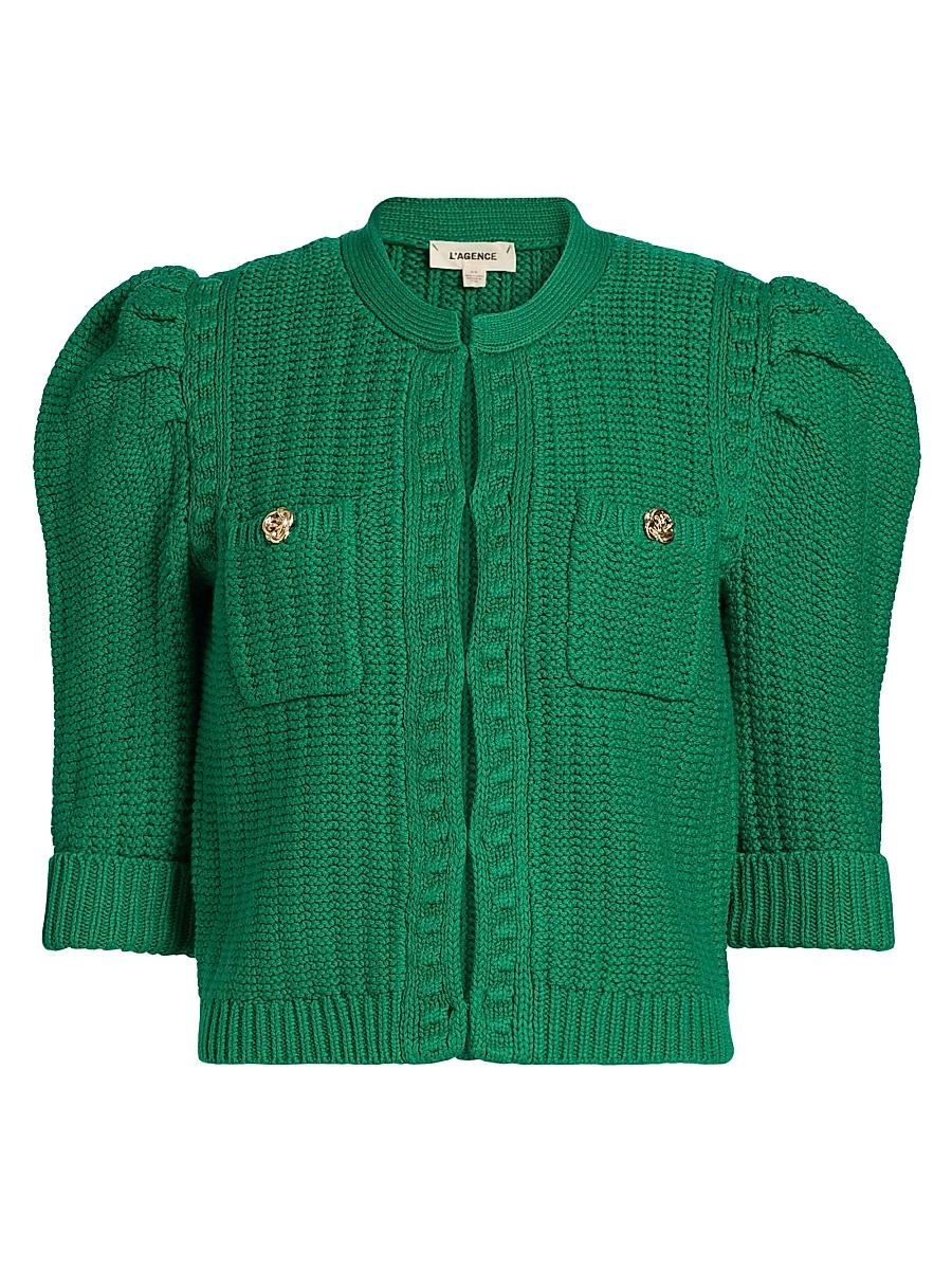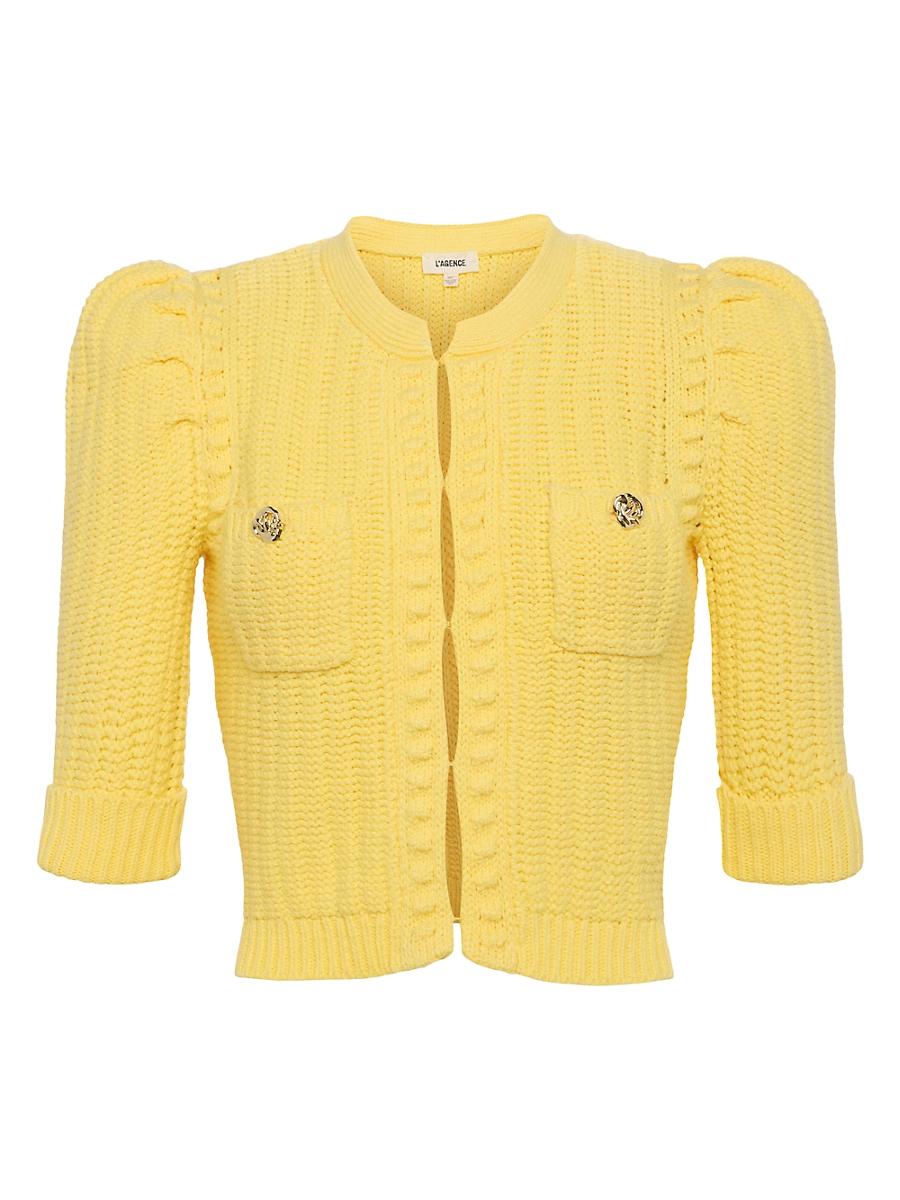 The Delilah cardigan from LAGENCE features a fitted, cropped silhouette crafted of a textured knit. Half puff sleeves and patch pockets with goldtone button details define the look. Band collar Half sleeves Chest patch pocket Front hook-and-eye closure 59% cotton/38% acrylic/2% nylon/1% spandex Dry clean Imported SIZE & FIT About 19 from shoulder to hem Model measurements: 510 tall Model is wearing a US size Small ABOUT THE BRAND Founded in 2008, LAgence marries Southern California ease with chic Parisian style. Using luxurious fabrics, the Los Angeles-based label delivers feminine collections that are both timeless and versatile. In 2015, the label launched a denim line in a range of sleek, impeccably tailored cuts. Contemporary Sportswear - Workshop > Lagence > Saks Fifth Avenue > Barneys. LAGENCE. Color: Pale Yellow. Size: XXS.