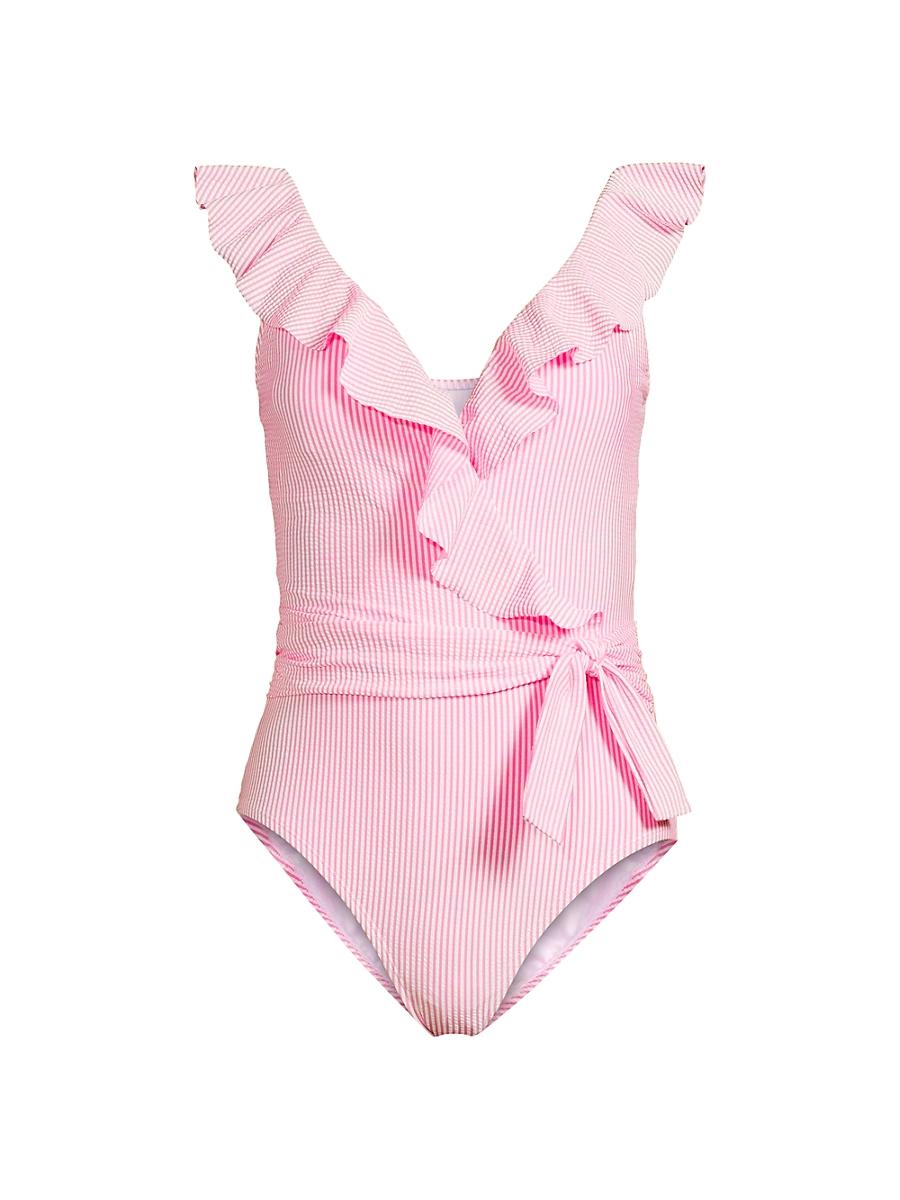 Crafted of striped seersucker, Lilly Pulitzers Delphie swimsuit features a flounce neckline and straps. Surplice neck Adjustable straps Self-tie waist Pulls on 75% nylon/25% spandex Hand wash Made in USA SIZE & FIT Model measurements: 510 tall Model is wearing a US size 4. Outerwear And Swimwear - Contemporary Swim > Lilly Pulitzer > Saks Fifth Avenue > Barneys. Lilly Pulitzer. Color: Roxie Pink Swim Stripe. Size: 10.