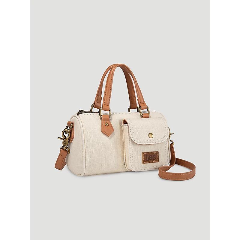 "Designed with plenty of pocket space, the barrel bag comes with both a zippered pocket and open pocket, all sealed with a top zipper closure to keep your belongings safe. Made from denim canvas with a leather trim and secured with metal feet at the bottom, it’s the quality you love in your favorite handbag. Size Dimensions: 8"" (W)x 3""(D) x 5.5""(H) Leather LEE logo on the front pocket Zipper closure Inside of the bag includes a zippered pocket and an open pocket Metal feet on the bottom for protection and stability Detachable and adjustable crossbody strap included Double round handle (Drop 3"") Made of canvas and PU leather trimmed" Cotton Denim. Tan. One Size.