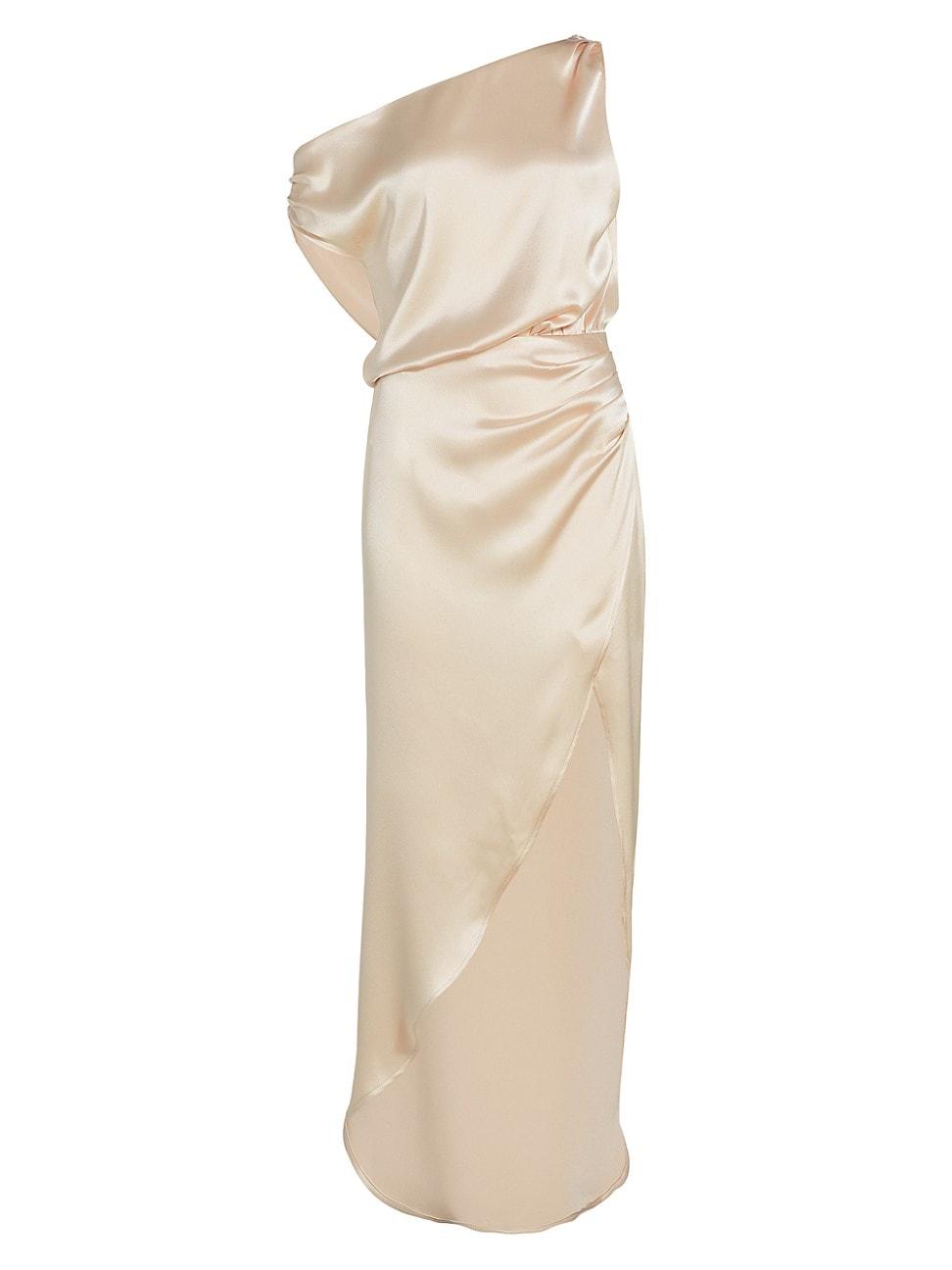 The Dinah gown from Nonchanlant Label features a one-shoulder blouson bodice and a draped tulip skirt. A thigh-high slit finishes this sleek satin style. One-shoulder neckline One off-the-shoulder sleeve Thigh-high slit 73% acetate/27% polyester Dry clean only Imported SIZE & FIT About 61 from shoulder to hem Model measurements: 510 tall Model is wearing a US size Small. Contemporary Sportswear - Trend > Nonchalant Label > Saks Fifth Avenue > Barneys. Nonchalant Label. Color: Blush. Size: Medium.