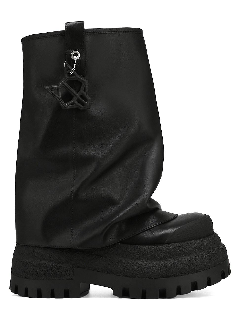 Introducing Disturb, our latest 90mm chunky boots with an asymmetric toe shape, designed for those who appreciate bold fashion statements. This boots features a wide leg fit for comfort and style, complemented by a distinctive Wolfe head ball charm for added flair. It also includes new rubber toe and heel pieces, combining durability with a modern aesthetic. Perfect for trendsetters seeking both edge and elegance, this boot is a must-have for any fashion-forward wardrobe. 90mm / 3.5 heel height 65mm / 2.5 platform height Tread height 25mm / 0.9 Crepe textured midsole 100% Full Leather Upper 100% Fabric lining Wolfe head ball chain deboss logo Full leather insole featuring new embossed logo Asymmetric toe Custom designed rubber toe piece and heel piece Imported. Lsd Shoes - Shoes Lsd Mp > Naked Wolfe > Saks Fifth Avenue > Barneys. Naked Wolfe. Color: Black. Size: 7.