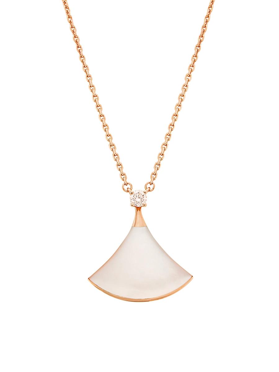 From the Divas Dream Collection. Inspired by feminine elegance and the enchanting allure of the eternal city, this necklace pays homage to the most glamorous divas with an unmistakable Roman spirit. Quintessentially feminine and refined, it is sculpted in a way that captures the magnificence of the Caracalla Bathsmarble and the sensual curves of its fan-shaped mosaics, reflecting the very essence of Italian beauty. Cast in 18K rose gold with a pendant set with mother-of-pearl, pav rubies and a white diamond. Diamond, 0.10 tcw Mother-of-pearl Ruby 18K rose gold Made in Italy SIZE Length, about 16 to 17 ABOUT THE BRAND Founded in Italy in 1884 by Greek silversmith Sotirio Bulgari, BVLGARI has become synonymous with unparalleled craftsmanship and exquisite jewelry. The brands Roman heritage can be seen in pieces inspired by the citys architecture, artwork and ancient mosaics. Today, the house continues to translate its rich history into opulent designs and fragrances. Fine Jewelry - Bvlgari Watches And Jewe > Bvlgari > Saks Fifth Avenue > Barneys. BVLGARI. Color: Pink Gold.