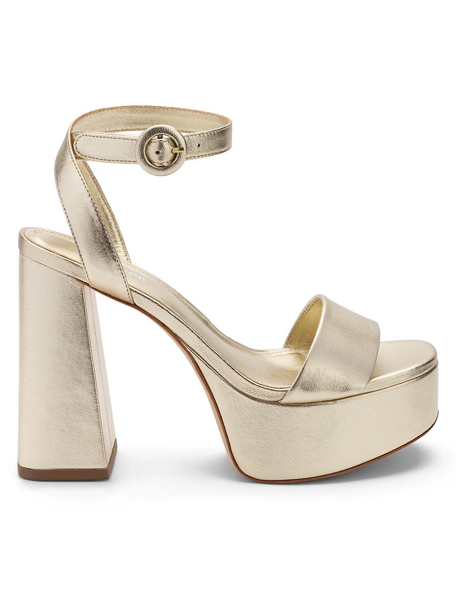 Crafted of leather, these Dolly sandals from Larroud flaunt a metallic finish. This pair sits atop a platform sole and a tall, block heel. Leather upper Open toe Adjustable buckle Leather lining & sole Imported SIZE Block heel, 4.5 (114mm) Platform height, 1.5. Womens Shoes - Contemporary Shoes > Larroud > Saks Fifth Avenue > Barneys. Larroud. Color: Mettalic Platina. Size: 9.