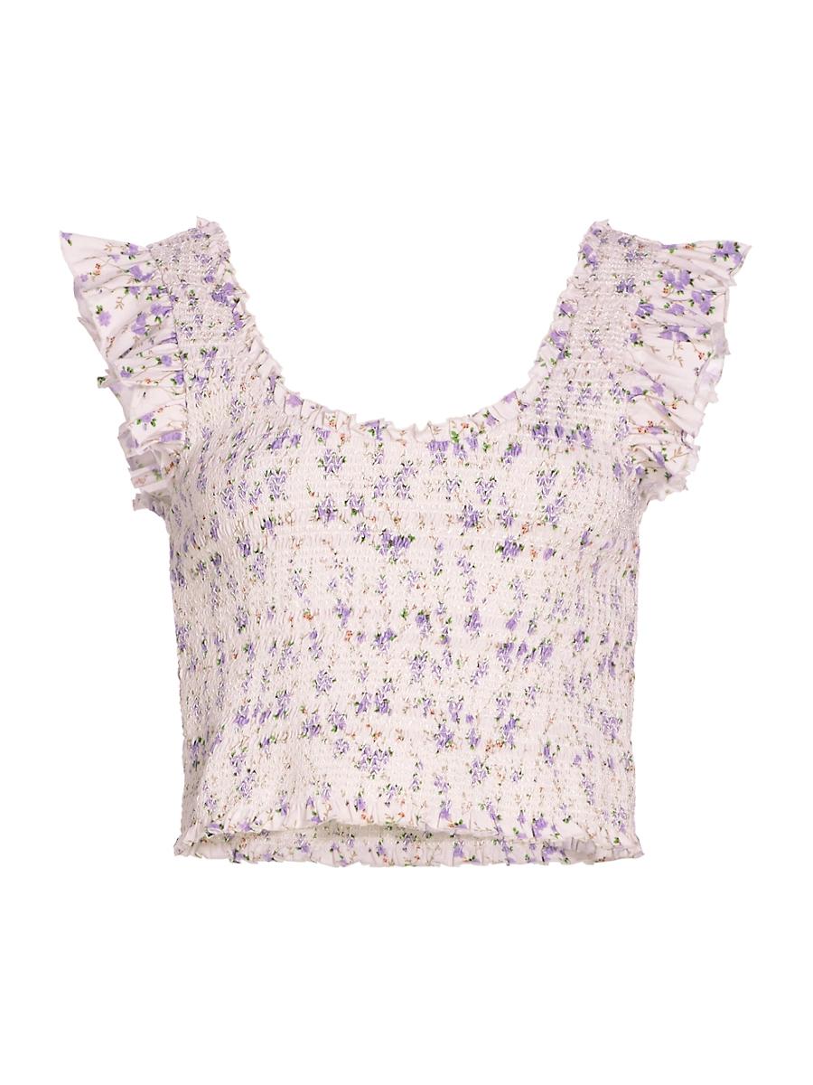 Adorned with a delicate floral print, LoveShackFancys Dovi top features a smocked bodice and frilly flutter sleeves. Scoopneck Flutter sleeves Pulls over 100% cotton Hand wash Imported SIZE & FIT About 18 from shoulder to hem Model measurements: 510 tall Model is wearing a US size Small. Contemporary Sportswear - Trend > Loveshackfancy > Saks Fifth Avenue > Barneys. LoveShackFancy. Color: Dusty Lavender. Size: XL.