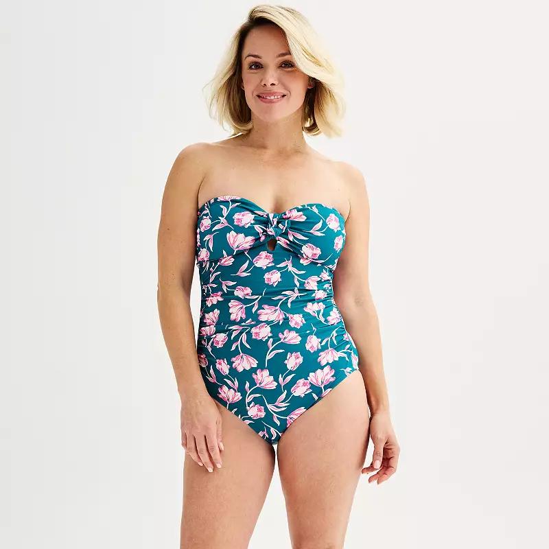 For a trendy poolside look, slip on this womens bow-front bandeau one-piece swimsuit with removable straps from DRAPER JAMES RSVP.Click on this WOMENS GUIDE to find the perfect fit and more! For a trendy poolside look, slip on this womens bow-front bandeau one-piece swimsuit with removable straps from DRAPER JAMES RSVP. Click on this WOMENS GUIDE to find the perfect fit and more! FEATURES Removable cups for support. Adjustable and removable halter strap Side shirring for waist and hip minimizing Removable cups Tie front for bust enhancement Moderate coverage Bust enhancer Knit, smooth construction UPF 50+ sun protection No closure - pullover styling Partially lined Lined gusset WirelessFABRIC & CARE Nylon, spandex Lining: polyester Gusset lining: polyester Hand wash and line dry Imported Size: Small. Color: Med Green. Gender: female. Age Group: adult.