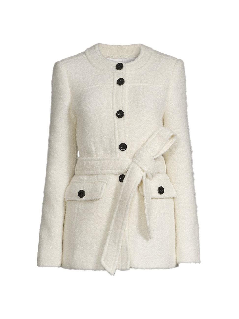 Crafted of a warm wool blend, Toccins jacket features a longline silhouette and cinching self-tie belted waist. Contrasting front buttons complete the look. Round neck Long sleeves Waist flap pockets Button-front closure 60% wool/23% cotton/17% polyester Dry clean Imported SIZE & FIT About 29 from shoulder to hem Model measurements: 510 tall Model is wearing a US size 4. Modern Collections - Branded Separates > Toccin > Saks Fifth Avenue > Barneys. Toccin. Color: Ivory. Size: 0.