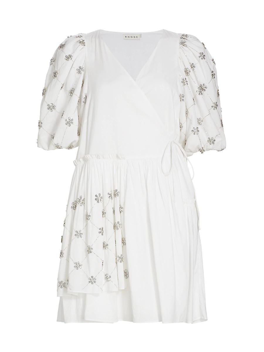 Rhodes Elsa wrap minidress is crafted of cotton. This style features short balloon sleeves, a ruffled skirt, and crystal bead embellishments. Surplice neck Short balloon sleeves Side-tie-waist closure 100% cotton Dry clean Imported SIZE & FIT Oversized About 35.5 from shoulder to hem Model measurements: 510 tall Model is wearing a US size Small. Contemporary Sportswear - Contemporary Collections > Rhode > Saks Fifth Avenue > Barneys. Rhode. Color: White Daisy Crystal. Size: Small.