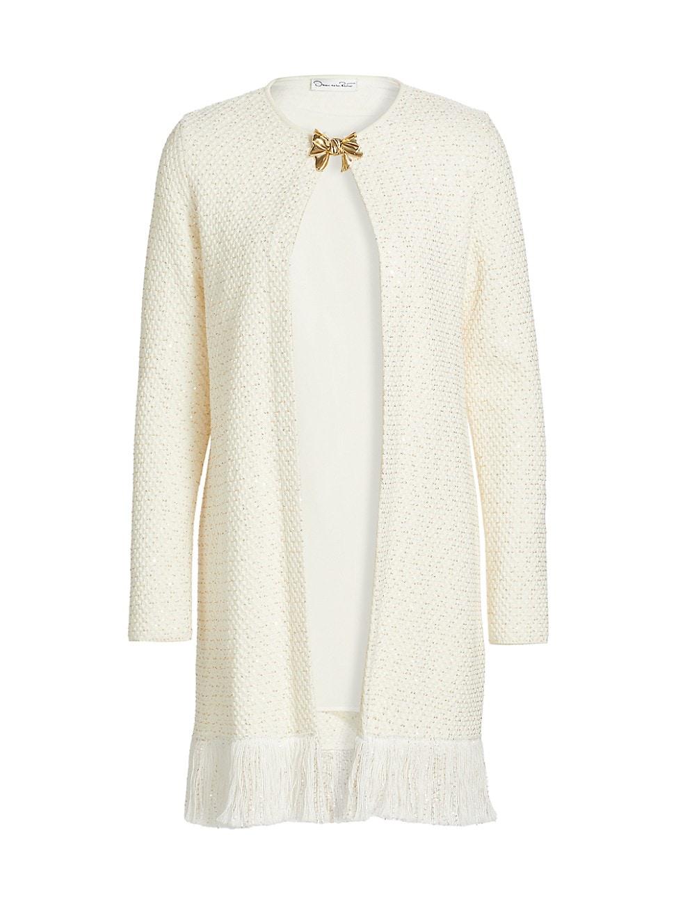 This Oscar de la Renta coat dress is crafted of a tweed fabric and embellished with sequin embroidery. Showcasing a fringed hem, this piece is complete with goldtone bow hardware at the crewneck. Crewneck Long sleeves Front hook-and-eye closure 62% viscose/27% polyester/11% nylon Lining: 98% polyester/2% elastane Dry clean Made in Italy SIZE & FIT Model measurements: 510 tall Model is wearing US size Small ABOUT THE BRAND After working for some of fashions greatest designers, Oscar de la Renta started his own line in 1965. He was an instant hit, thanks to his penchant for romantic silhouettes in vibrant colors and prints. His iconic legacy lives on through Creative Directors Fernando Garcia and Laura Kims stunning vision for the brands ready-to-wear and accessories. Designer Evening - Oscar De La Renta > Oscar De La Renta > Saks Fifth Avenue > Barneys. Oscar de la Renta. Color: Ivory Gold. Size: XS.