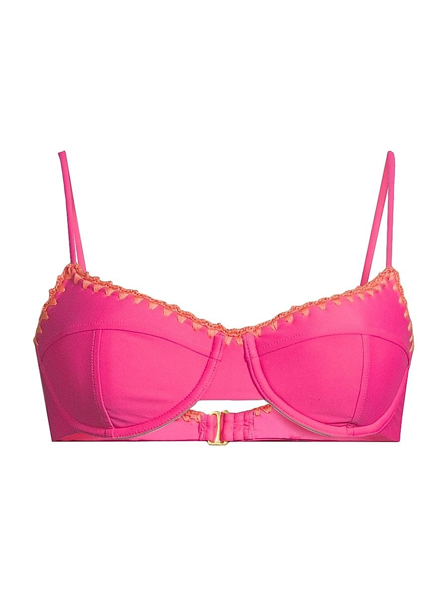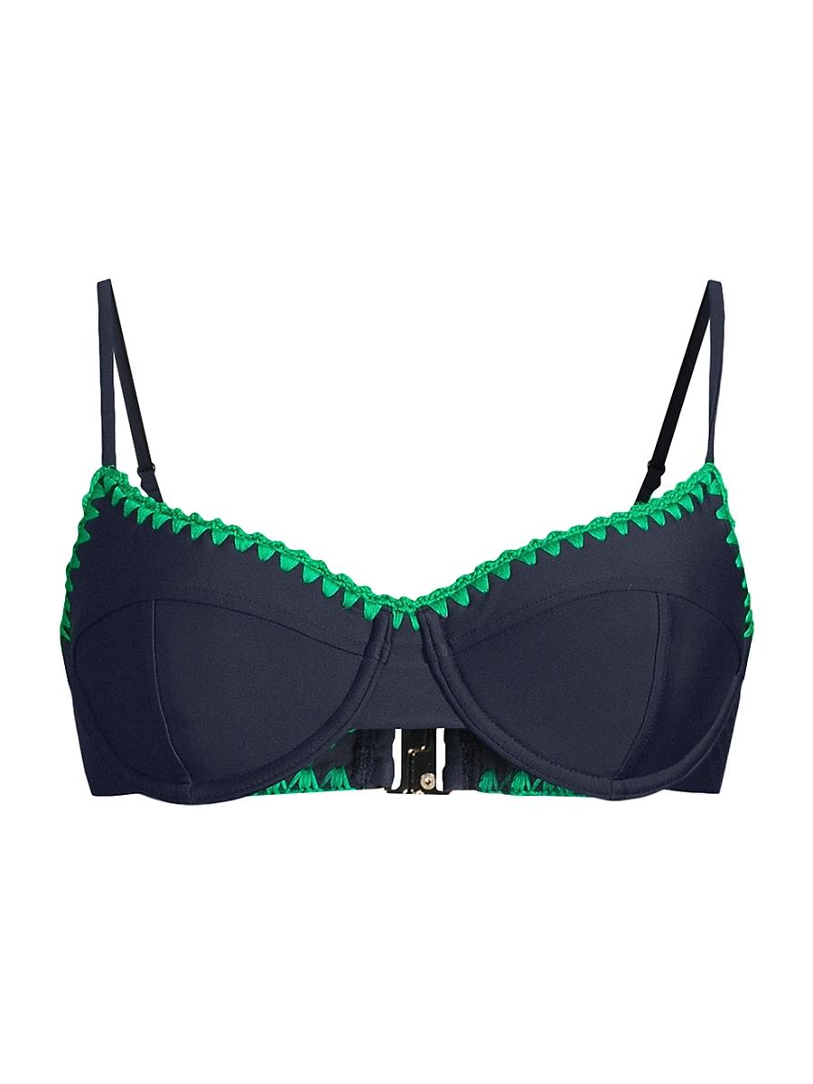 Ramy Brooks Emmeline bikini top features a balconette silhouette, underwire cups, and contrasting whip-stitch. Sweetheart Adjustable straps Back-hook clasp closures 82% nylon, 18% spandex Lining: 92% polyester, 8% spandex Hand wash Imported SIZE & FIT Model measurements: 511 tall Model is wearing a US size Small Please note: Bikini bottom sold separtely. Outerwear And Swimwear - Contemporary Swim > Ramy Brook > Saks Fifth Avenue > Barneys. Ramy Brook. Color: Pool Side White Crochet Trim. Size: XS.