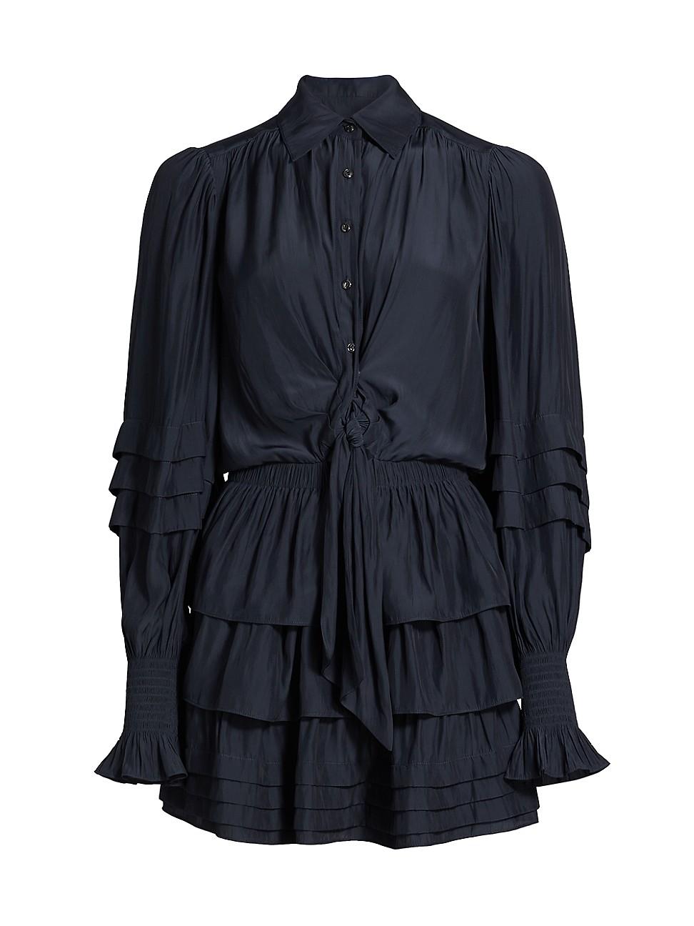 This Entela mini-shirtdress from Ramy Brook is designed with a spread collar, shirred detailing, and a tiered ruffle skirt. Spread collar Long sleeves, shirred cuffs Elasticized waist Tiered ruffle skirt Button-front closure 100% polyester Dry clean Imported SIZE & FIT About 33 from shoulder to hem Model measurements: 510 tall Model is wearing a US size Small. Contemporary Sportswear - Contemporary Collections > Ramy Brook > Saks Fifth Avenue > Barneys. Ramy Brook. Color: Navy. Size: Large.
