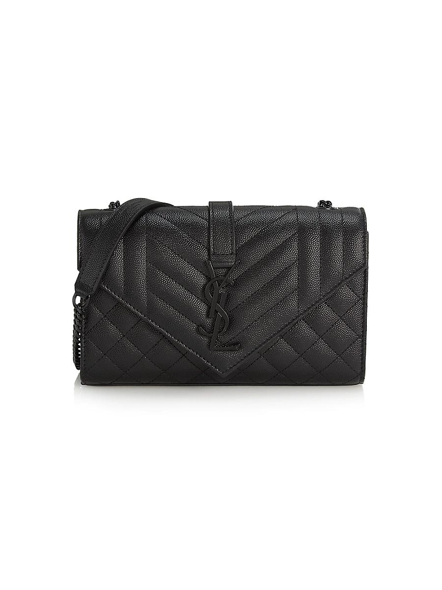 Saint Laurent monogram envelope bag made with metal-free tanned leather, with a front flap and magnetic snap closure, decorated with metal YSL initials and a mix of vertical, chevron and diamond quilted overstitching, featuring a leather and chain strap that can be worn two ways. Worn crossbody or on shoulder Black metal hardware Magnetic snap button fastening Exterior: One flat open pocket at the back Interior: One main compartment, one flat pocket Grosgrain lining SIZE 8.2W X 5.1H X 2.3D Strap Drop, 21.6. Lsd Handbags - Saint Laurent > Saint Laurent > Saks Fifth Avenue > Barneys. Saint Laurent. Color: Nero.