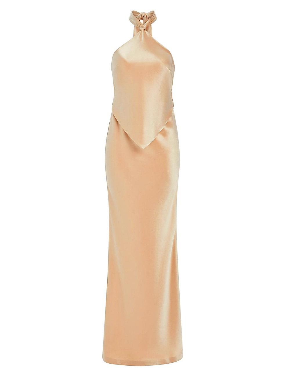 retrofete Ester Dress in Peach. Size XXS, XS, M, L, XL. Self: 76% acetate 24% polyester Lining: 97% viscose 3% spandex. Made in China. Dry clean only. Partially lined. Hidden back zipper closure Halterneck and back tie closure. Satin fabric with back vent. ROFR-WD552. PF23-7229. Retrofete, launched in 2018 by co-founders Ohad Seroya and Aviad Klin, embodies the glamour and opulence of decades past. Having gained notoriety for its sequin-clad party frocks, the New York-based label has evolved into a collection of daring, top-to-toe designs that seamlessly transform from day to night. Regardless of where she goes, you can count on the Retrofete girl to bring the party.