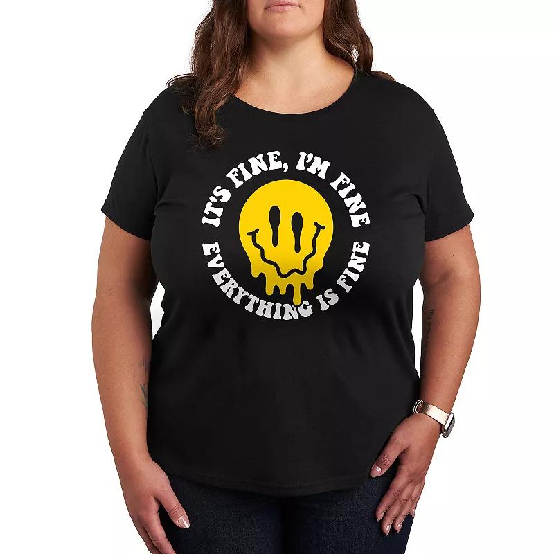 Black Everything Is Fine Melted Smile Graphic Tee - Women, Juniors, Plus & Petite Plus. All-cotton tee printed with a playful graphic. Full graphic text: Its fine, Im fine, everything is fine.Size S: 26 long from high point of shoulder to hemSize & fit: Relaxed-fit garment with a slightly longer hem. Fits true to size.100% cottonMachine wash; tumble dryImported, screen printed in the USA