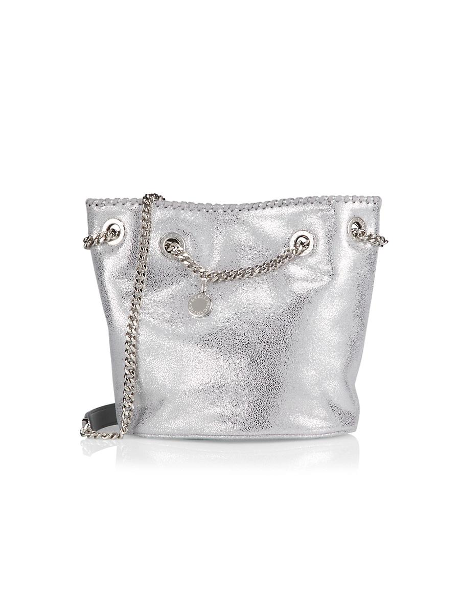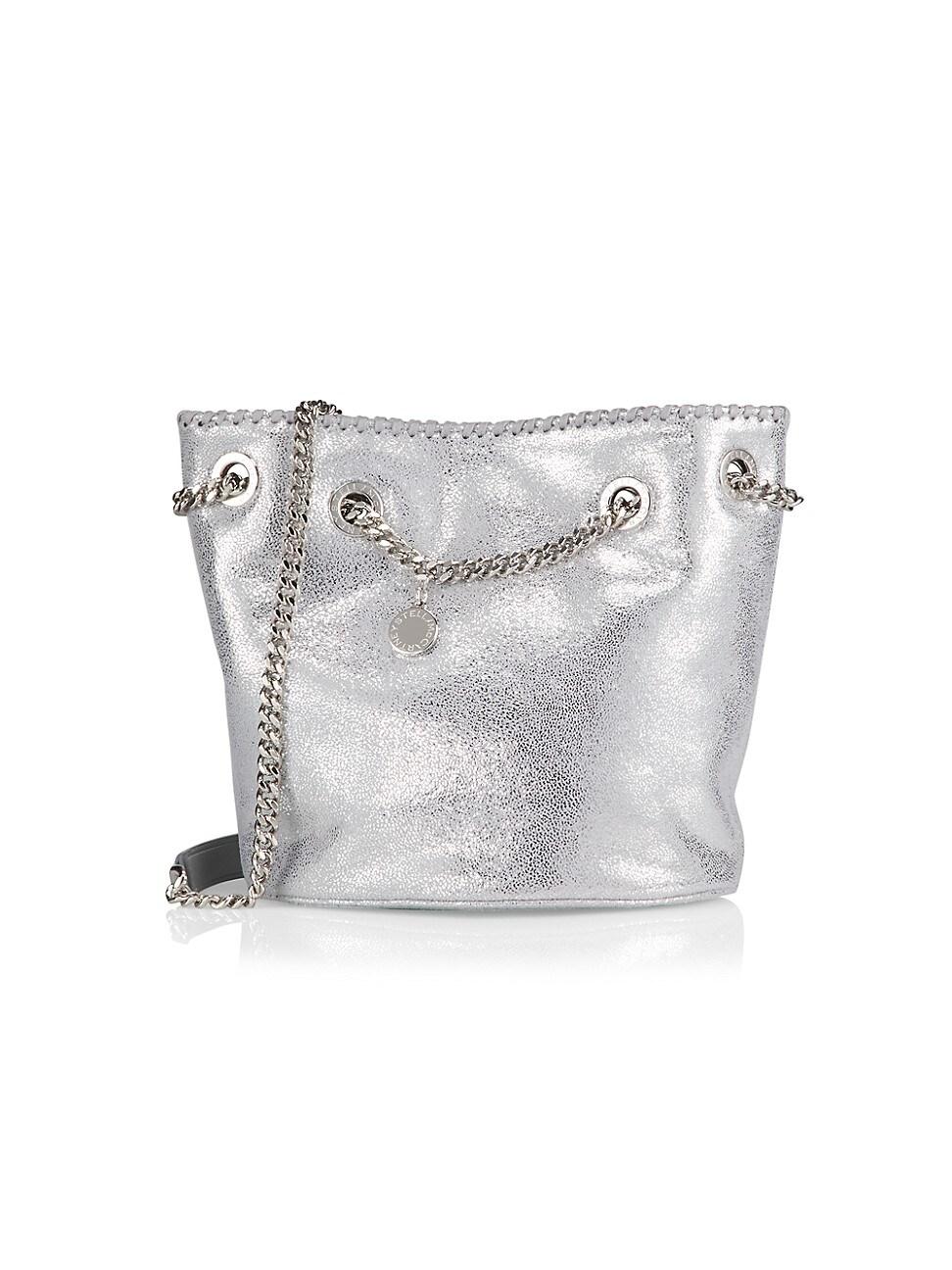 Silvery chains suspend an Italian-crafted bucket bag fashioned from faux leather with a shimmer-struck finish. Magnetic closure Chain shoulder strap Interior wall pocket Structured silhouette with flat base for stability Logo-jacquard lining made from recycled water bottles Synthetic Made in Italy Designer Handbags