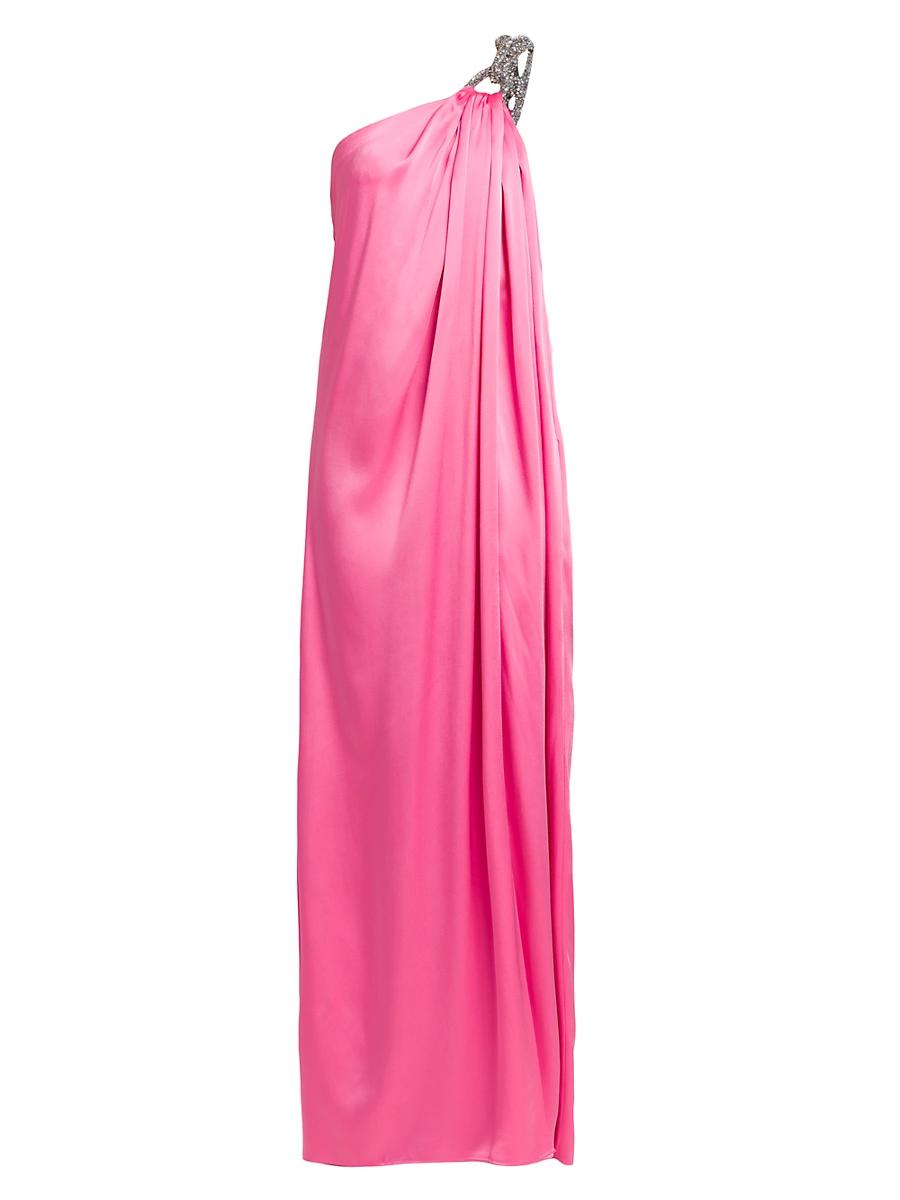Crafted of satin, Stella McCartneys stunning Falabella gown features a glittering crystal-encrusted shoulder chain and sultry side slit. One-shoulder neckline Side on-seam pockets Pulls over 64% acetate/36% viscose Crystals: glass Dry clean Imported SIZE & FIT About 60 from shoulder to hem Model measurements: 510 tall Model is wearing a US size 4 ABOUT THE BRAND From interning at Christian Lacroix at 16 to her role as Chlos Creative Director, Stella McCartney made a name for herself in the fashion industry well before the launch of her own brand in 2001. Since its inception, McCartney has remained dedicated to sustainability and taken an ethically minded design approach-never using leather, feathers, skin or fur in any of her pieces. Today, the brand is renowned for its bold, feminine ready-to-wear and accessories, as well as its foray into menswear, kids clothing and fragrances. Advanced European - Stella Mccartney Rtw > Stella Mccartney > Saks Fifth Avenue > Barneys. Stella McCartney. Color: Bright Pink. Size: 6.
