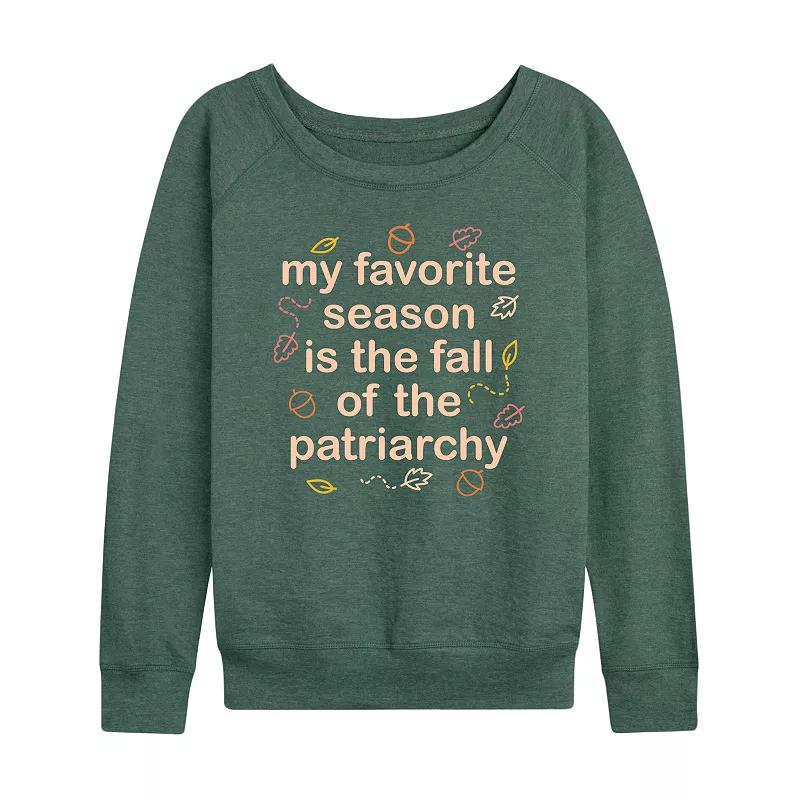 Heather Juniper Fall Of The Patriarchy Slouchy Pullover - Women, Juniors, Plus & Petite Plus. Stay snug as you pull on this slouchy pullover boasting soft and breathable cotton-blend French terry material. A sassy message completes your look with statement-making detail. Full graphic text: My favorite season is the fall of the patriarchy.Size S: 24 long from high point of shoulder to hemLightweight French terry knit60% cotton / 40% polyesterMachine wash; tumble dryImported, screen printed in the USA