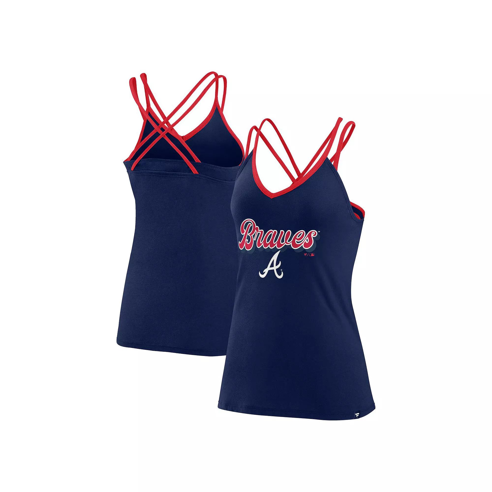 During the heat of baseball season, keep cool in this Atlanta Braves Go For It Strappy tank top. This fashionable design by Fanatics Branded features a flattering V-neckline and contrasting straps that accentuate the team graphics on the chest. Blended material adds to the comfortable feel of this Atlanta Braves top.During the heat of baseball season, keep cool in this Atlanta Braves Go For It Strappy tank top. This fashionable design by Fanatics Branded features a flattering V-neckline and contrasting straps that accentuate the team graphics on the chest. Blended material adds to the comfortable feel of this Atlanta Braves top.PRODUCT FEATURESOfficially licensedImportedV-neckMaterial: 50% Cotton/50% PolyesterSleevelessSpaghetti straps cross in backScreen print graphicsMachine wash, tumble dry lowBrand: Fanatics Branded Color: BRV NAVY. Gender: female. Age Group: adult.