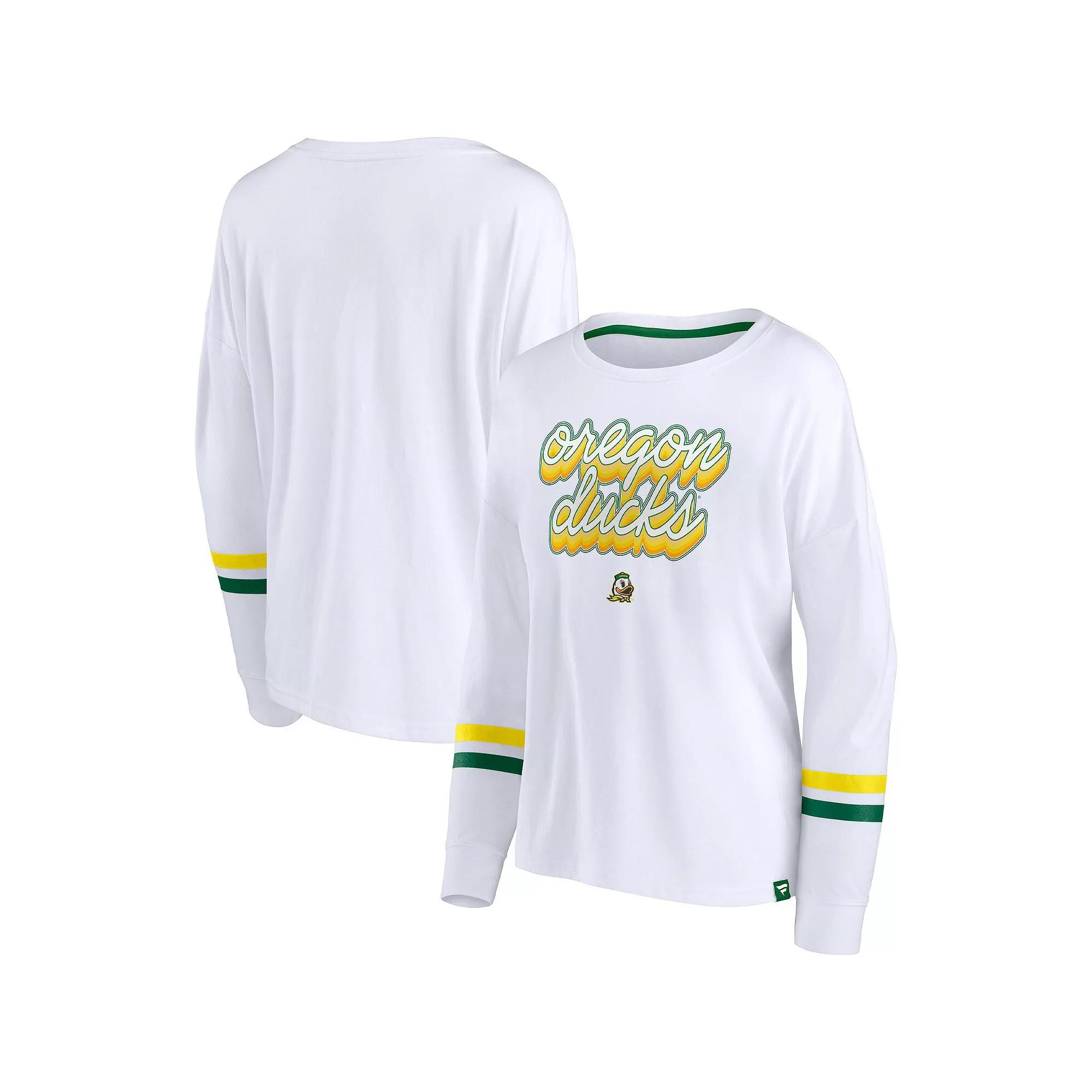 Let your Oregon Ducks spirit stand out with this trendy Fanatics Branded Power T-shirt. It features groovy Oregon Ducks graphics and stripes for a retro look. From casual wear to game day, the soft fabric and comfy crew design offer maximum comfort with each wear.Let your Oregon Ducks spirit stand out with this trendy Fanatics Branded Power T-shirt. It features groovy Oregon Ducks graphics and stripes for a retro look. From casual wear to game day, the soft fabric and comfy crew design offer maximum comfort with each wear.PRODUCT FEATURESBrand: Fanatics BrandedImportedTagless CollarRib-knit cuffsLong sleeveMachine wash, tumble dry lowDropped shoulderScreen print graphicsCrew neckMaterial: 50% Cotton/50% PolyesterOfficially licensed Color: White. Gender: female. Age Group: adult.