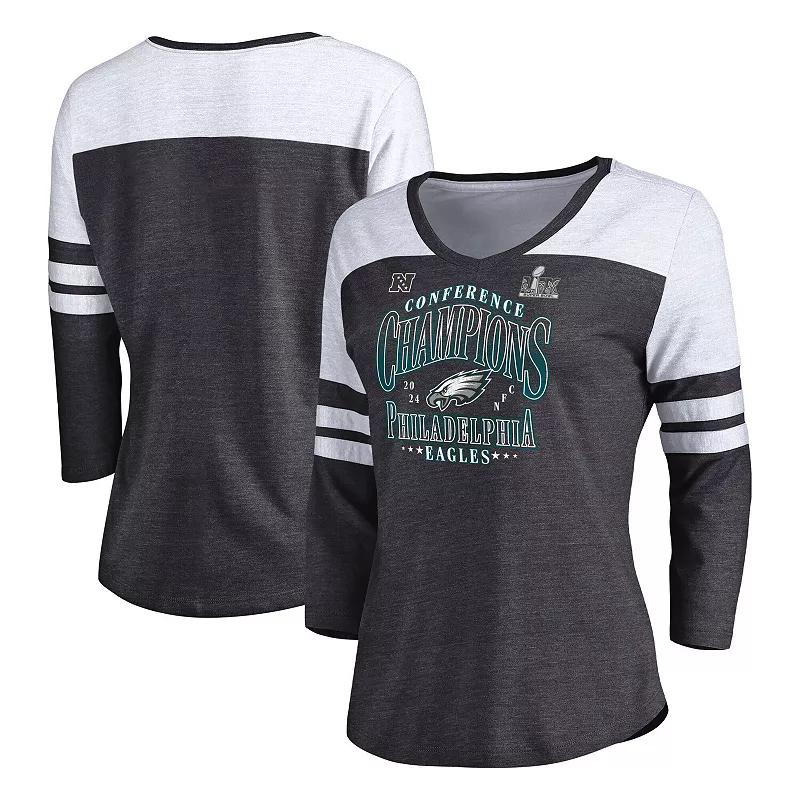 After a hard-fought season full of epic plays and clutch touchdowns, the Philadelphia Eagles have become the 2024 NFC Champions. Celebrate their big win with this Tri-Blend 3/4 Sleeve V-Neck T-Shirt from Fanatics. Featuring commemorative 2024 NFC Champions graphics, youll be able to remember this exciting moment in Philadelphia Eagles history for years to come.After a hard-fought season full of epic plays and clutch touchdowns, the Philadelphia Eagles have become the 2024 NFC Champions. Celebrate their big win with this Tri-Blend 3/4 Sleeve V-Neck T-Shirt from Fanatics. Featuring commemorative 2024 NFC Champions graphics, youll be able to remember this exciting moment in Philadelphia Eagles history for years to come.PRODUCT FEATURESScreen print graphicsV-neckRounded droptail hem3/4 Length sleeveMaterial: 50% Polyester/ 38% Cotton/ 12% RayonBrand: FanaticsMachine wash, tumble dry lowImportedOfficially licensed Color: Charco. Gender: female. Age Group: adult.
