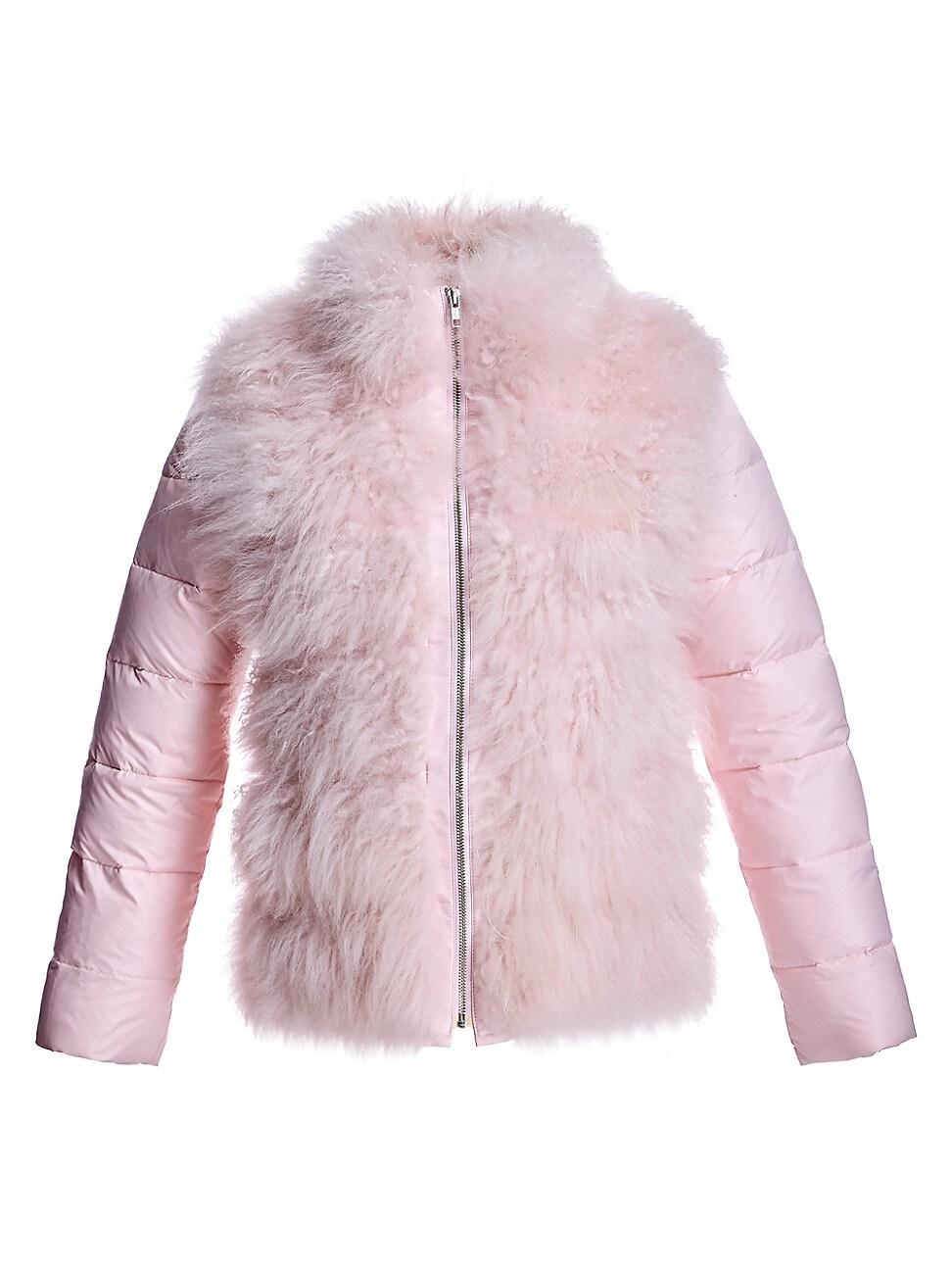 Feather down jacket with cashmere goat fur trim on front. Stand collar Long straight sleeves, slit pockets Exterior shell is 100% polyester Lining is 100% polyester. Type: Dyed cashmere goat Origin: China Professional cleaning only Imported SIZE & FIT About 24 from shoulder to hem Model measurements: 510 tall Model is wearing a US size Small. Furs - Fur Salon Direct > Maximilian > Saks Fifth Avenue > Barneys. Maximilian. Color: Pale Pink. Size: Large.