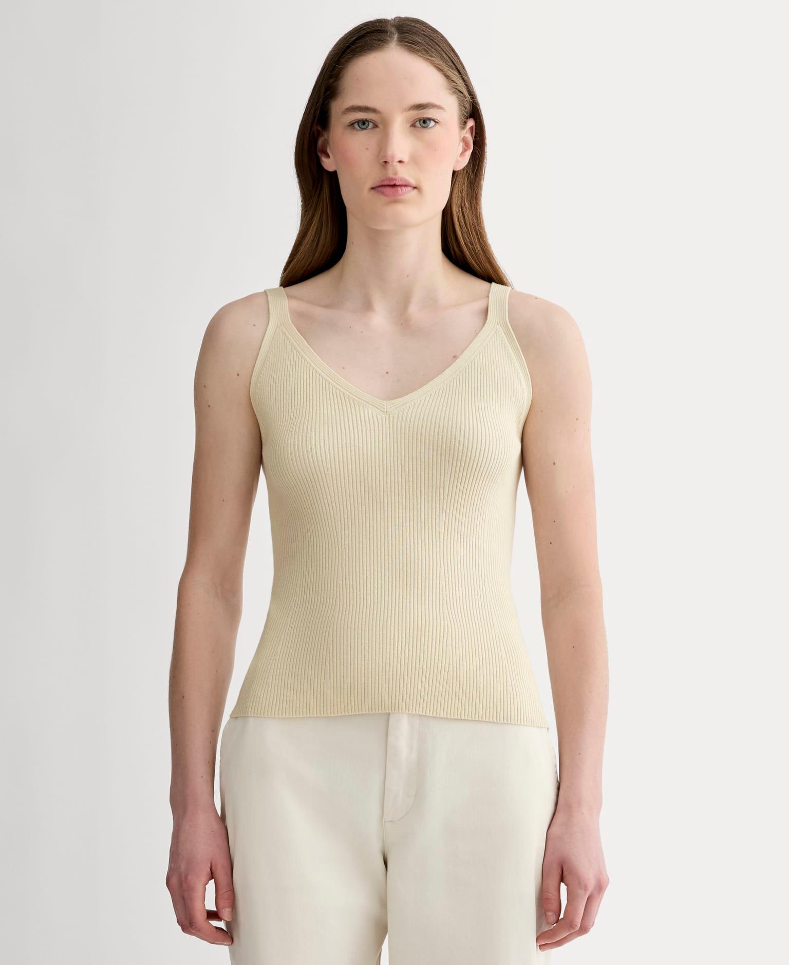 A cami, but give it lightweight sweater vibes. Featuring a front and back V-neck, it has-thin-bra-friendly straps for just the right amount of shoulder/collarbone reveal. Detailing at the waist gives it a fitted silhouette, perfect for topping your high or low-waisted pants and shorts. Made with a viscose and certified organic cotton blend, it’s soft, slinky, and ribbed. And if you love this style, it comes as a dress too for a midi-length take.
