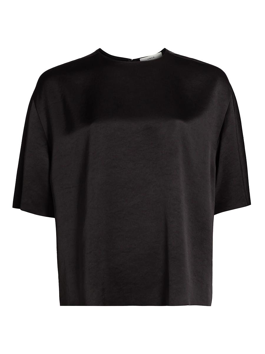 Crafted of satin, this short-sleeved blouse from Vince highlights a crew neckline and short sleeves. Crewneck Short sleeves Back zip closure 92% rayon/ 8% spandex Lining: 100% polyester Machine wash Imported SIZE & FIT About 26 from shoulder to hem Model measurements: 510 tall Model is wearing a US size Small. Contemporary Sportswear - Vince > Vince > Saks Fifth Avenue > Barneys. Vince. Color: Black. Size: XXS.