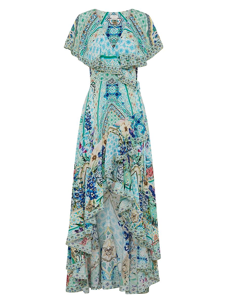 Crafted of silk, this Camilla maxi dress highlights a wrap silhouette detailed with short frill sleeves and a hi-lo hemline. An intricate floral and geometric print adorns this style. V-neck Short frill sleeves Side self-tie wrap closure 100% silk Dry clean Imported SIZE & FIT Model measurements: 510 tall Model is wearing a US size Small. Outerwear And Swimwear - Contemporary Swim > Camilla > Saks Fifth Avenue > Barneys. Camilla. Color: Sunrise In Sintra. Size: Small.