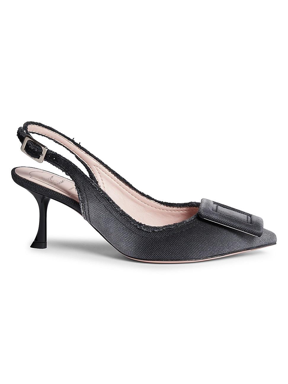 Crafted of washed denim, Roger Viviers slingback pumps are designed witha a pointed toe, an oversized decorative buckle, and fringe trim. The pair is set atop a comfortable 65mm heel. Point toe Buckle closure Cotton upper Leather lining Leather sole Made in Italy SIZE Heel: about 2.5 (65mm). Womens Shoes - Roger Vivier Womens Shoe > Roger Vivier > Saks Fifth Avenue > Barneys. Roger Vivier. Color: Nero. Size: 10.5.