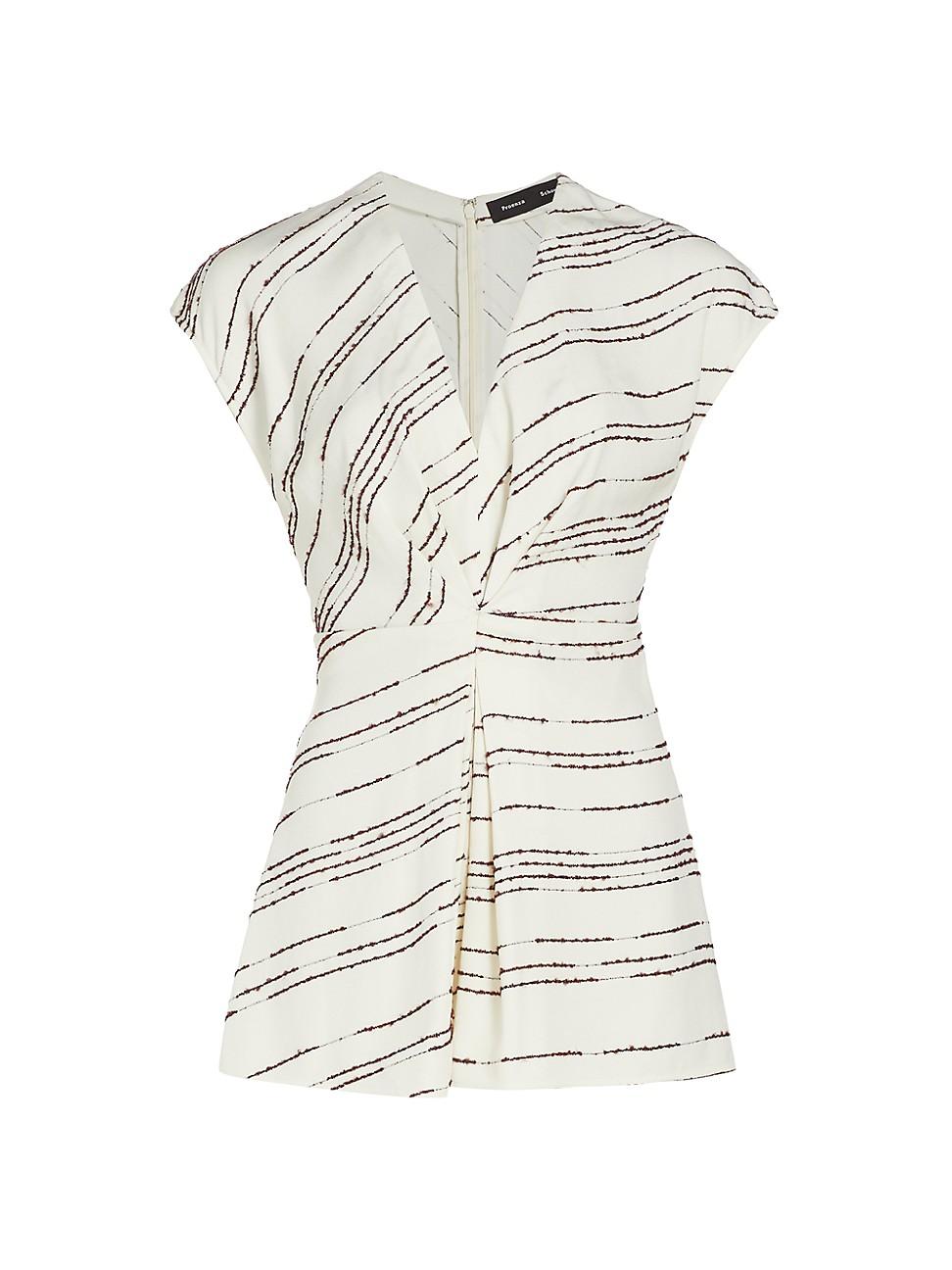 Proenza Schoulers cap-sleeve top offers an abstract striped print and gathered detailing at the waist. Plunging V-neck Cap sleeves Concealed back zip closure 95% viscose/5% polyester Dry clean Made in Italy SIZE & FIT About 27 from shoulder to hem Model measurements: 510 tall Model is wearing a US size 4 ABOUT THE BRAND Designers Jack McCollough and Lazaro Hernandez collaborated on their senior thesis at NYCs Parsons School of Design in 2002, which led to the official launch of Proenza Schouler-an homage to their mothers maiden names. Their innovative, well-tailored clothing has since earned them five CFDA awards. In 2008, the brand debuted a line of handbags, with the PS1 instantly gaining a cult following. Today, they also create sleek, edgy footwear. Designer Lifestyle - Proenza Schouler > Proenza Schouler > Saks Fifth Avenue > Barneys. Proenza Schouler. Color: White Multi. Size: 8.