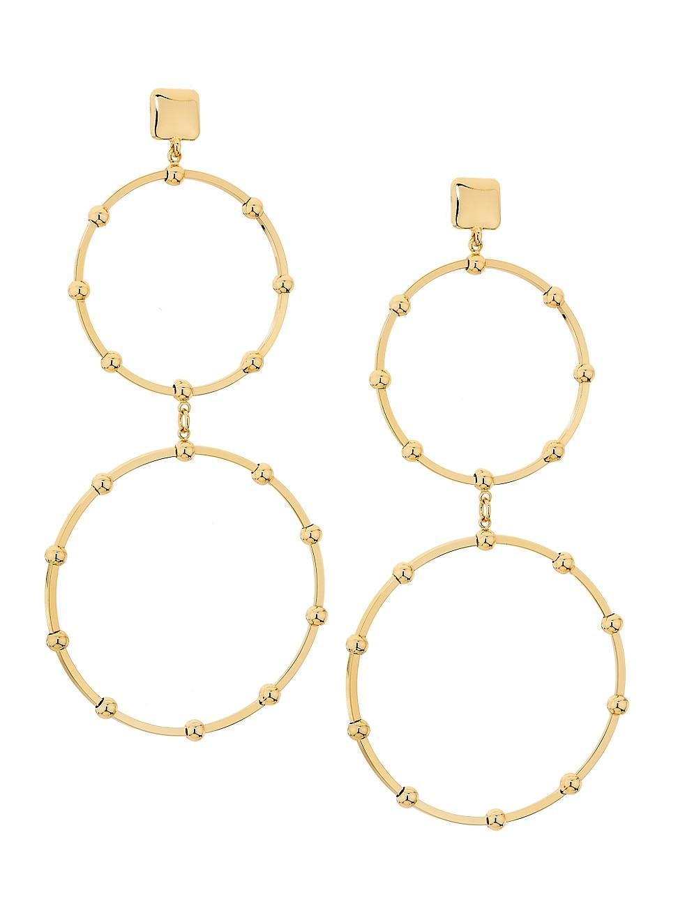 From the Geometrical Hoops Collection. Ramy Brooks Kairi goldtone earrings showcased two oversized circles suspended in a linear silhouette. Goldtone Post back Imported SIZE About 4.5L. Fashion Jewelry - Trend Jewelry > Ramy Brook > Saks Fifth Avenue > Barneys. Ramy Brook. Color: Gold.