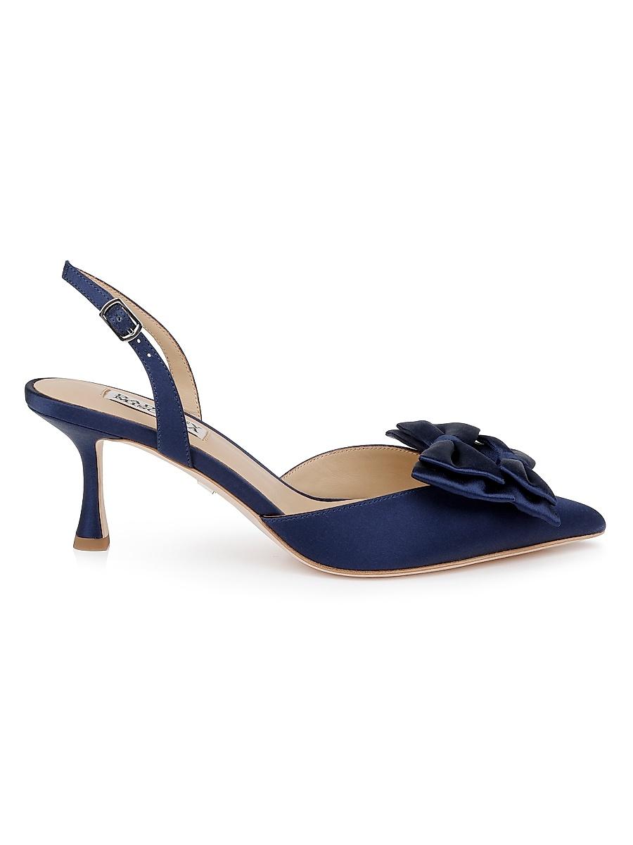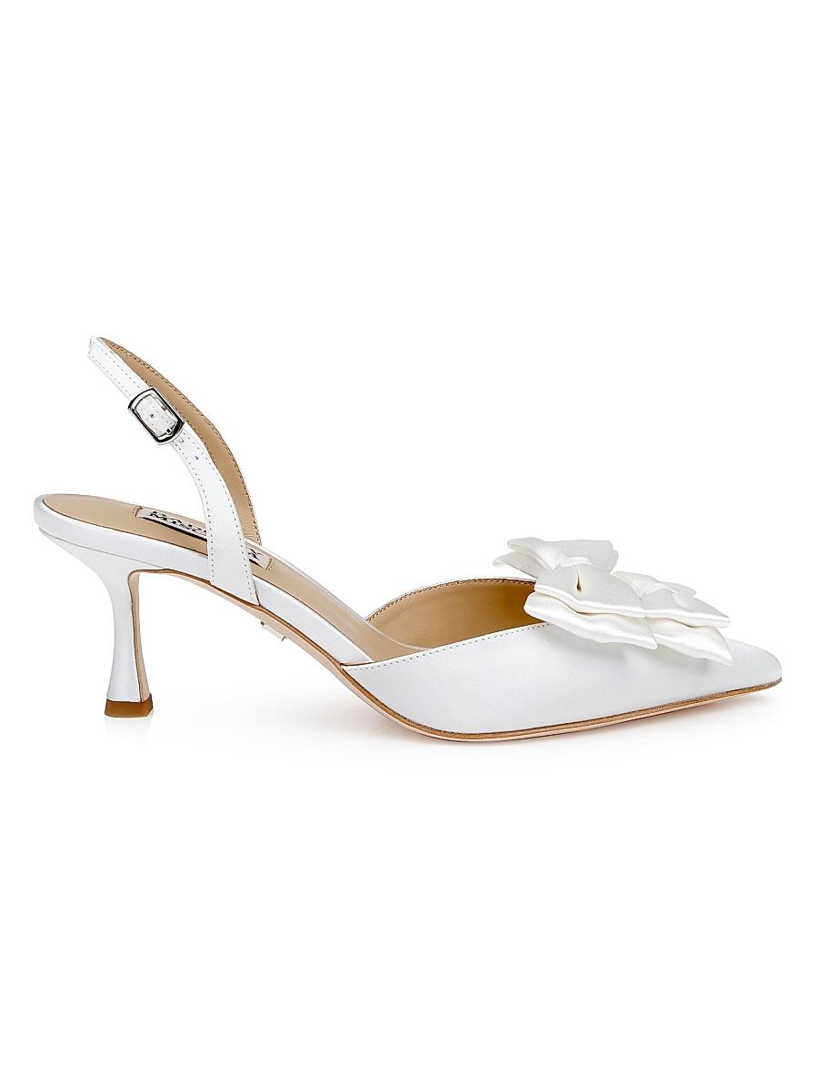 Crafted of luxe satin, these Giovanna pumps from Badgley Mischka feature double-bow details and a 65mm heel. Point toe Buckle closure Satin upper Leather lining Padded insole Leather sole Imported SIZE Heel: about 2.5 (65mm). Womens Shoes - Contemporary Shoes > Badgley Mischka > Saks Fifth Avenue. Badgley Mischka. Color: White Satin. Size: 8.5.