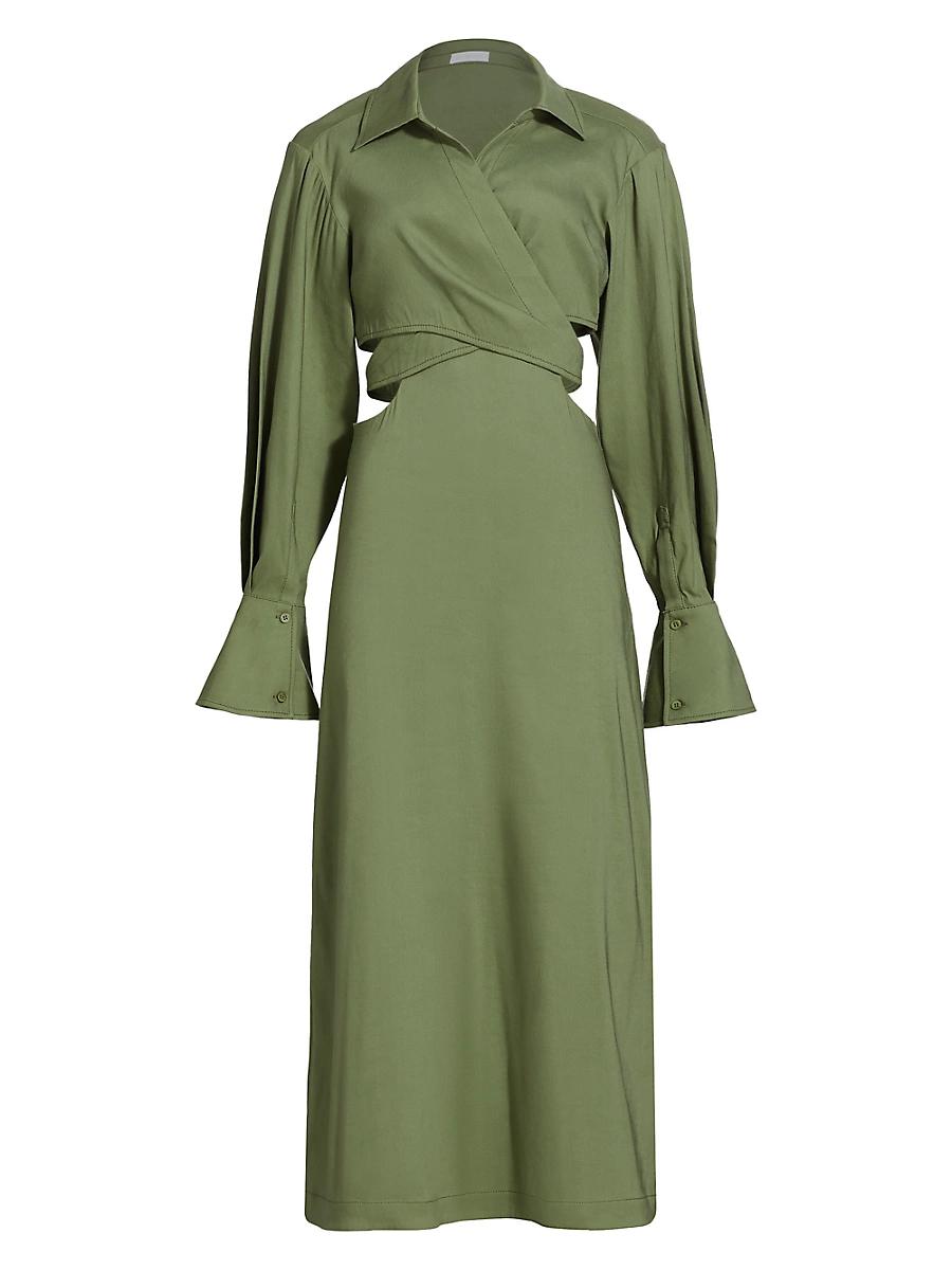 SIMKHAIs Giulia dress is crafted of a luxe linen blend and features a long-sleeve wrap design. Flared cuffs and a point collar complete this maxi-length piece. Point collar Long sleeves, buttoned cuffs Wrap bodice Back self-tie closure 51% linen/46% rayon/3% spandex Lining: 100% polyester Dry clean Imported SIZE & FIT About 52 from shoulder to hem Model measurements: 510 tall Model is wearing a US size 4. Contemporary Sportswear - Workshop > Simkhai > Saks Fifth Avenue > Barneys. SIMKHAI. Color: Verde. Size: 0.