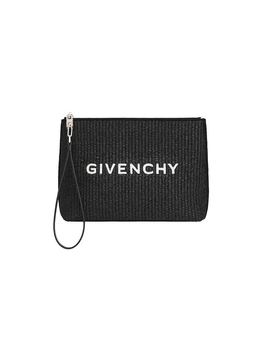 Givenchy travel pouch in raffia. Travel pouch in raffia White Givenchy signature embroidered on the front Zipped closure Removable leather strap Silvery-finish metal details One main zipped compartment 52% cotton, 48% polyamide Secondary materiel: 100% calfskin leather. Lining: 100% cotton Metal parts: 40% polyester, 40% brass, 20% zamac Dimensions: 11 in x 7.7 in x 2.8 in Made in: Italy. Lsd Handbags - Givenchy > Givenchy > Saks Fifth Avenue > Barneys. Givenchy. Color: Black. Size: 0.