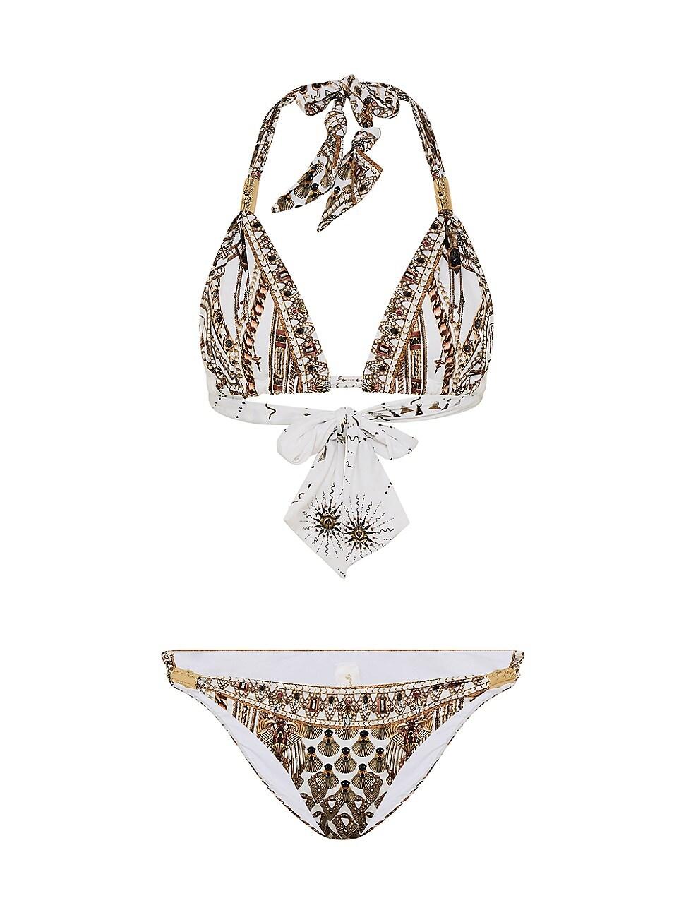 From the Goddess Energy Collection. This printed bikini from Camilla is styled with a halterneck top and low-rise bottom with goldtone hardware. 82% polyamide, 18% elastane. Hand wash. Imported. TOP Halterneck Triangle cups Back self-tie closure BOTTOM Pulls on SIZE & FIT Model measurements: 510 tall Model is wearing a US size Small. Outerwear And Swimwear - Contemporary Swim > Camilla > Saks Fifth Avenue > Barneys. Camilla. Color: Goddess Energy. Size: Large.