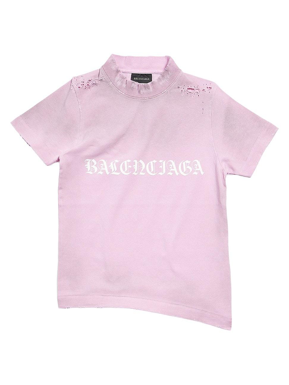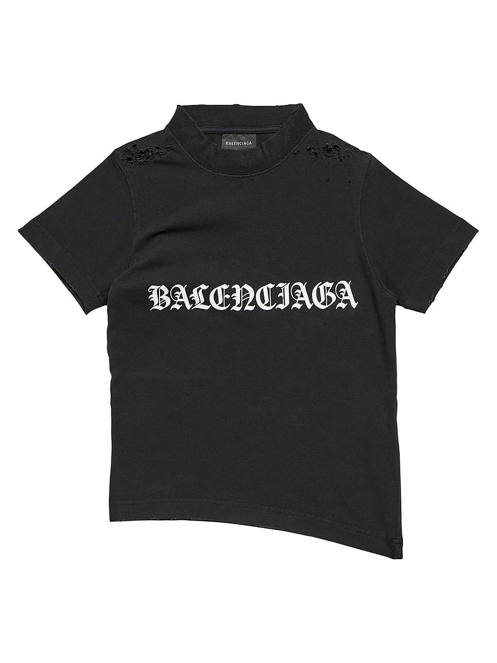 Gothic type shrunk t-shirt. Antique peeling stretch jersey Crewneck Short sleeves Cropped length Gothic type logo printed at front Cracked effect artwork Destroyed and dirty effect 94% cotton, 6% elastane Made in Portugal. Lsd Rtw - Balenciaga Rtw > Balenciaga > Saks Fifth Avenue > Barneys. Balenciaga. Color: Black White. Size: Medium.