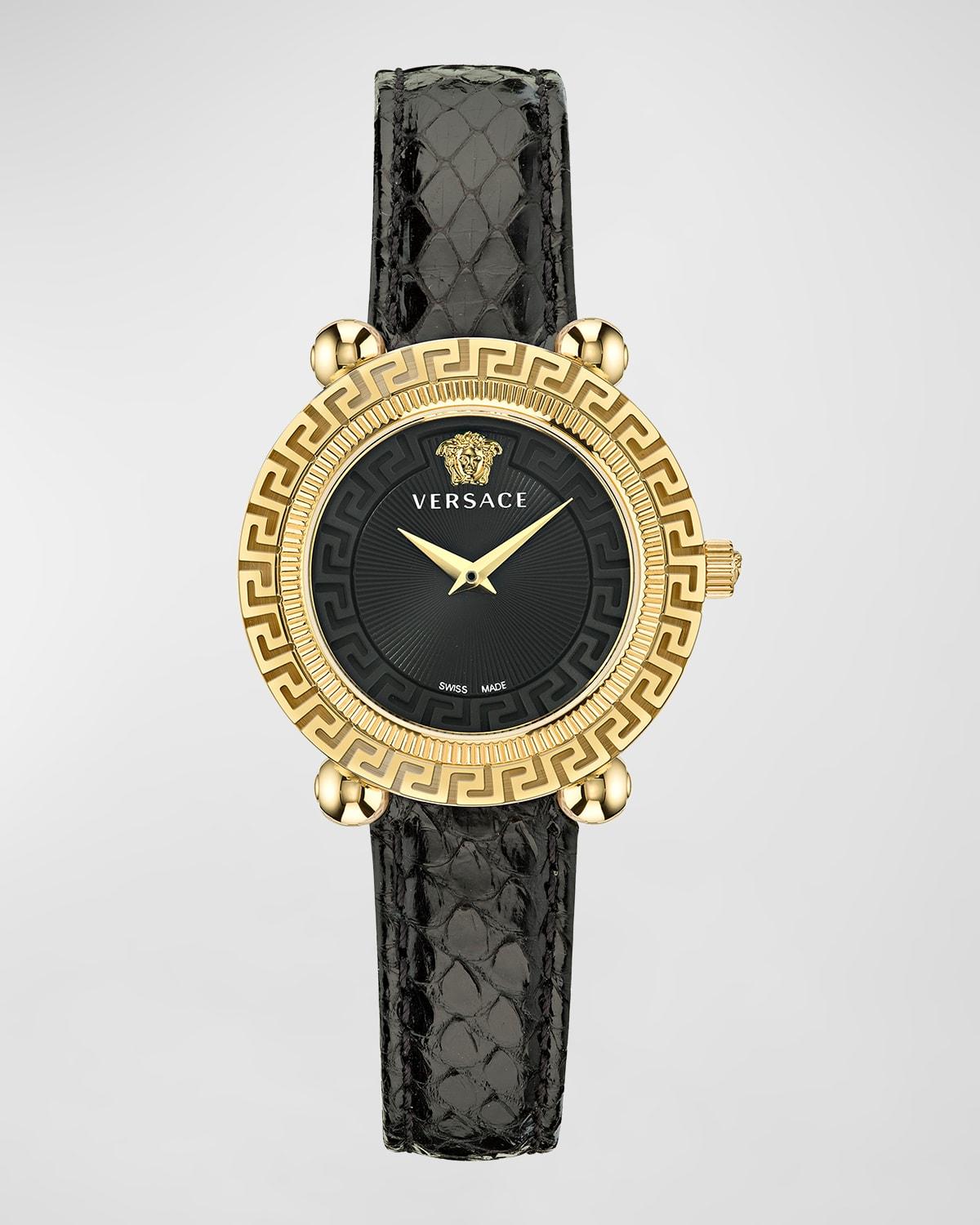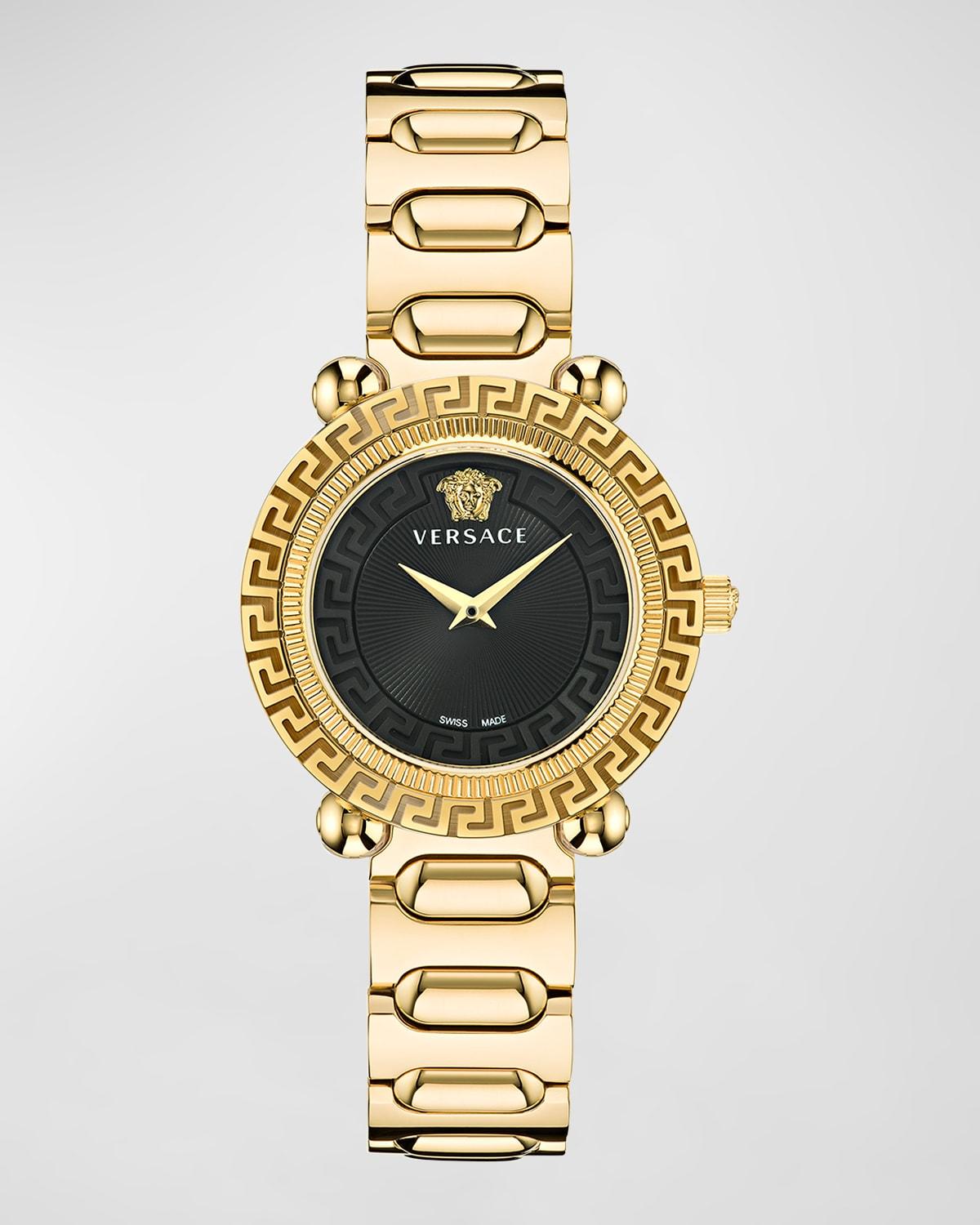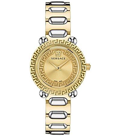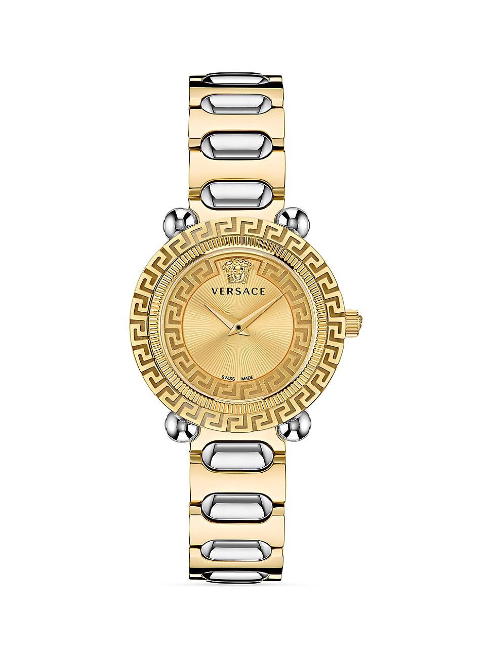 From the Greca Twist Collection. Designed with a vintage-inspired look, Versaces slim Greca Twist watch features a glossy goldtone case and two-tone bracelet with logo-engraved detailing. Swiss quartz two-hand movement Sapphire crystal Fixed bezel Gold guilloch dial Goldtone stainless steel case Two-tone stainless steel bracelet Deployant buckle clasp Made in Switzerland FEATURES Water-resistant to 5 ATM SIZE Round case, 35mm (1.38) Leather strap, 12.5mm (0.49) ABOUT THE BRAND Founded in 1978, Versace is instantly recognizable by the signature Medusa head logo, chosen by founder Gianni Versace for its Greek symbolism. The Italian label is known for its luxe, bold clothing, sneakers, shoes and accessories-think gilding, oversized logos and punchy prints. Since taking over artistic direction, Giannis sister Donatella Versace has maintained the brands strong identity, with a renewed vision to give customers the ultimate freedom to express themselves. Men Accessories - Watches And Gifts > Versace > Saks Fifth Avenue > Barneys. Versace. Color: Two Tone.