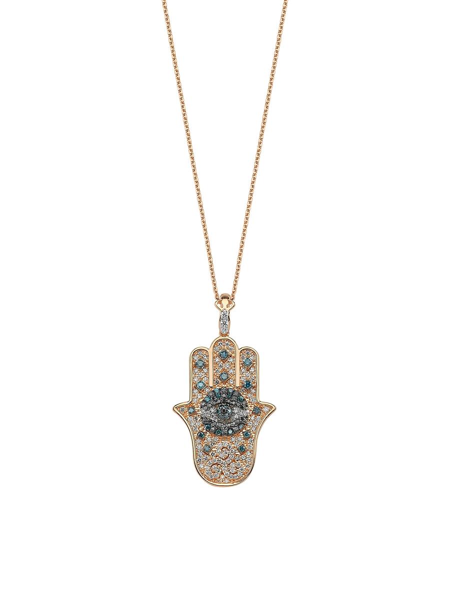 From the Hamsa Collection. Made of 14K rose gold, BEE GODDESS necklace features a hamsa hand pendant encrusted with sparkling blue, black, and colorless diamonds. Colorless diamonds, 0.5 tcw Diamond color grade: H Diamond clarity grade: VS-SI Blue diamonds, 0.22 tcw Black diamonds, 0.1 tcw 14K rose gold Imported SIZE Adjustable chain length, about 16.5-18.5 Pendant drop, about 1.38. Fashion Jewelry - Semi Prec Coll C > Bee Goddess > Saks Fifth Avenue > Barneys. Bee Goddess. Color: Rose Gold.