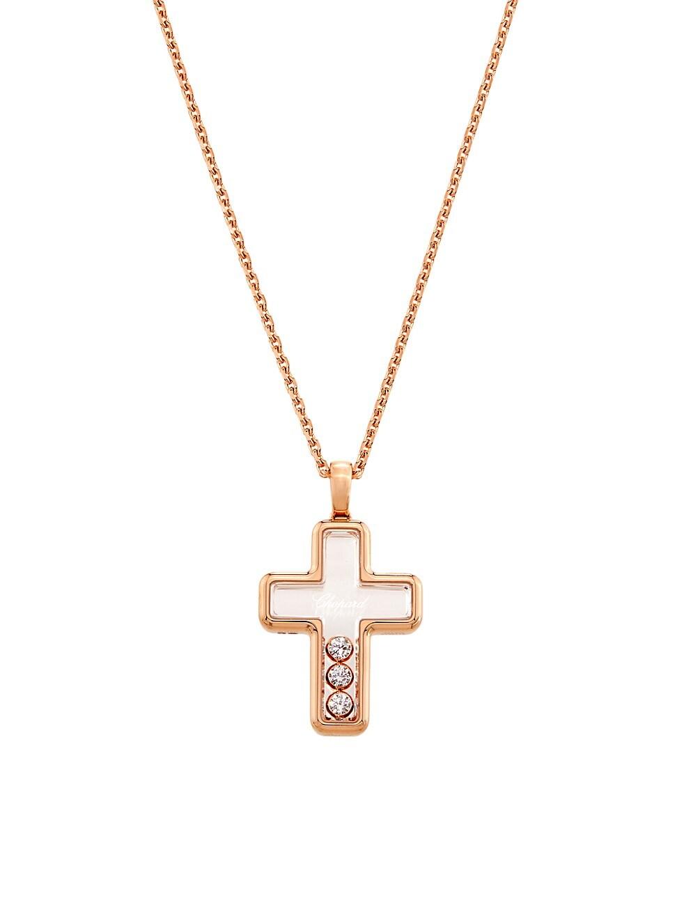 From the Happy Diamonds Collection. Crafted of 18K rose gold, Chopards necklace features a sapphire crystal cross pendant filled with three freely moving brilliant-cut diamonds. Diamonds, 0.15 tcw Diamond color grade: F-G Diamond clarity grade: IF 18K rose gold Lobster clasp Made in Gernmany ABOUT THE BRAND In 1860, artisan watchmaker Louis-Ulysse Chopard founded the renowned jewelry brand in Sonvilier, Switzerland. The company is known for its legendary Swiss watches and classic high fine jewelry designed to last a lifetime. Fine Jewelry - Chopard Watches And Jewe > Chopard > Saks Fifth Avenue > Barneys. Chopard. Color: Rose Gold.