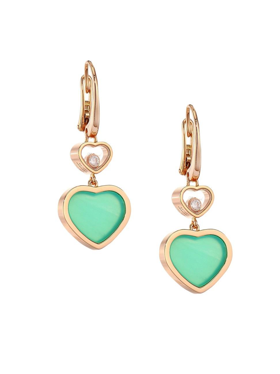 ONLY AT SAKS. From The Happy Hearts Collection. Dual heart drop earrings with diamond accent. Chrysoprase White diamond, 0.10 tcw 18K rose gold Hinge back Made in Germany ABOUT THE BRAND In 1860, artisan watchmaker Louis-Ulysse Chopard founded the renowned jewelry brand in Sonvilier, Switzerland. The company is known for its legendary Swiss watches and classic high fine jewelry designed to last a lifetime. Fine Jewelry - Chopard Watches And Jewe > Chopard > Saks Fifth Avenue > Barneys. Chopard. Color: Rose Gold.