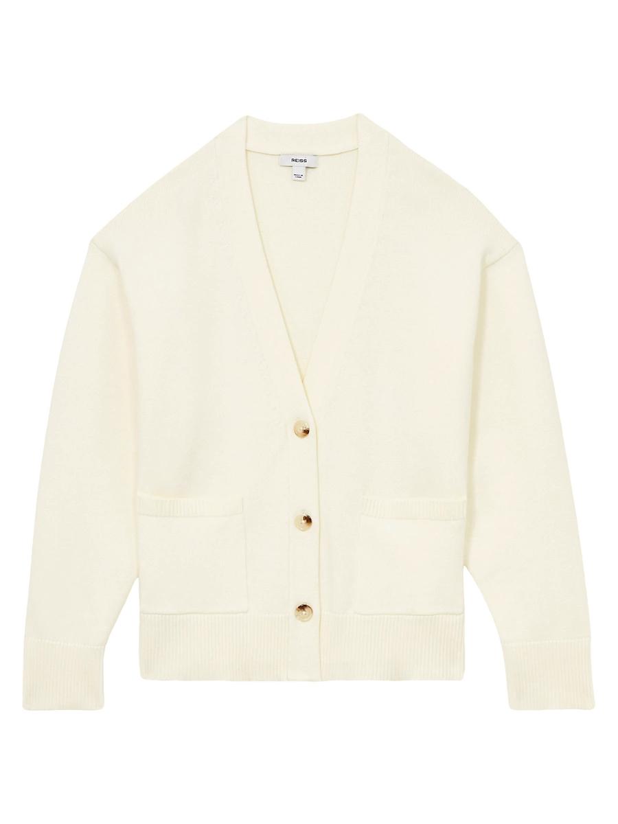 The Harper cardigan from Reiss highlights a chunky design detailed with rib-knit trim and tortoiseshell buttons. V-neck Long sleeves Side patch pockets Rib-knit trim Button-front closure 70% viscose/ 30% polyester Hand wash Imported SIZE & FIT Model measurements: 510 tall Model is wearing a US size Small. Modern Collections - Modern Trend > Reiss > Saks Fifth Avenue > Barneys. Reiss. Color: Ivory. Size: XS.